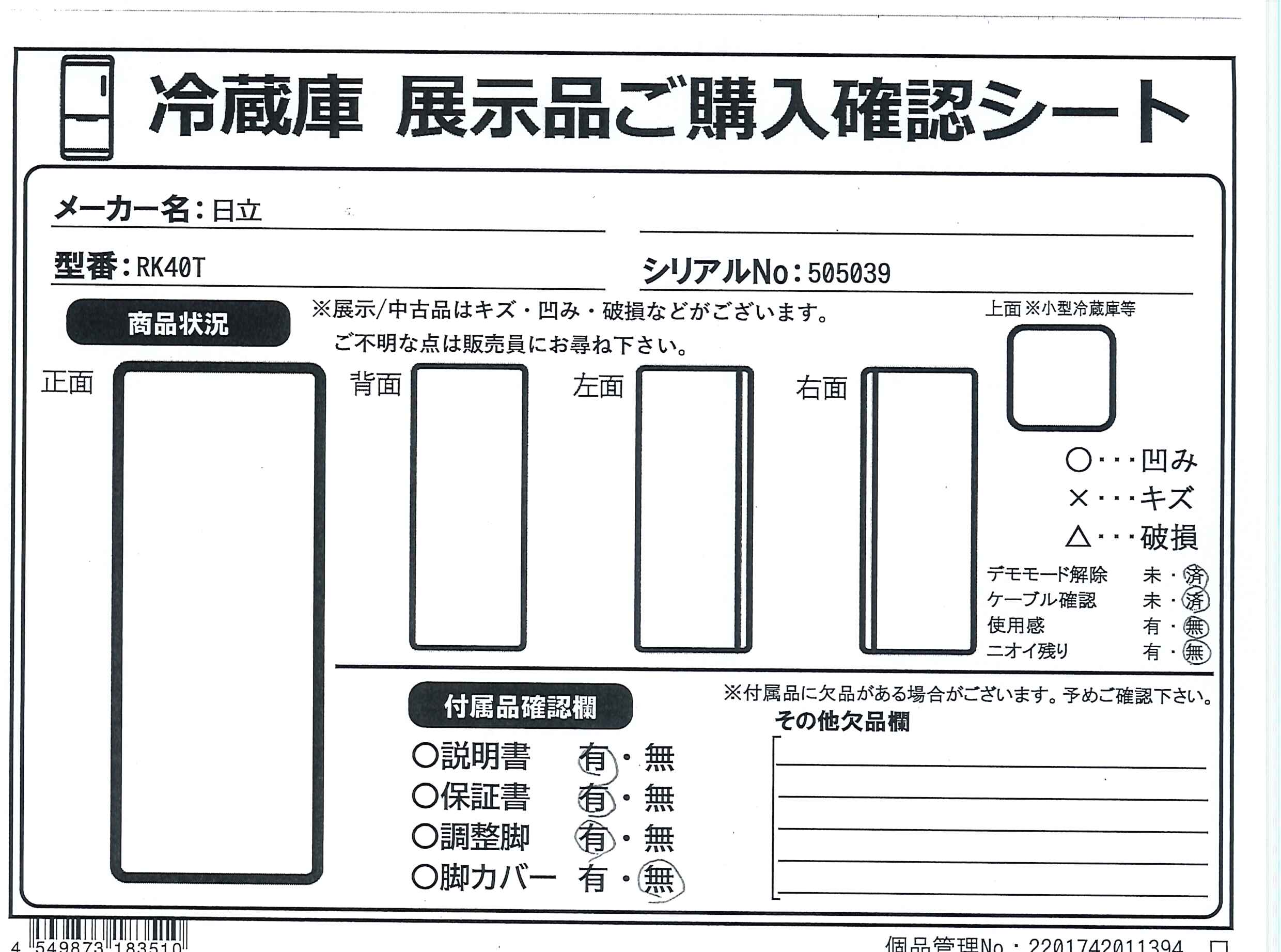 中古商品ランクについて 付属品・商品状態について 〔付属品〕説明書、調節脚×2、卵スタンド、給水タンク、製氷皿、製氷スコップ、アルミトレイ