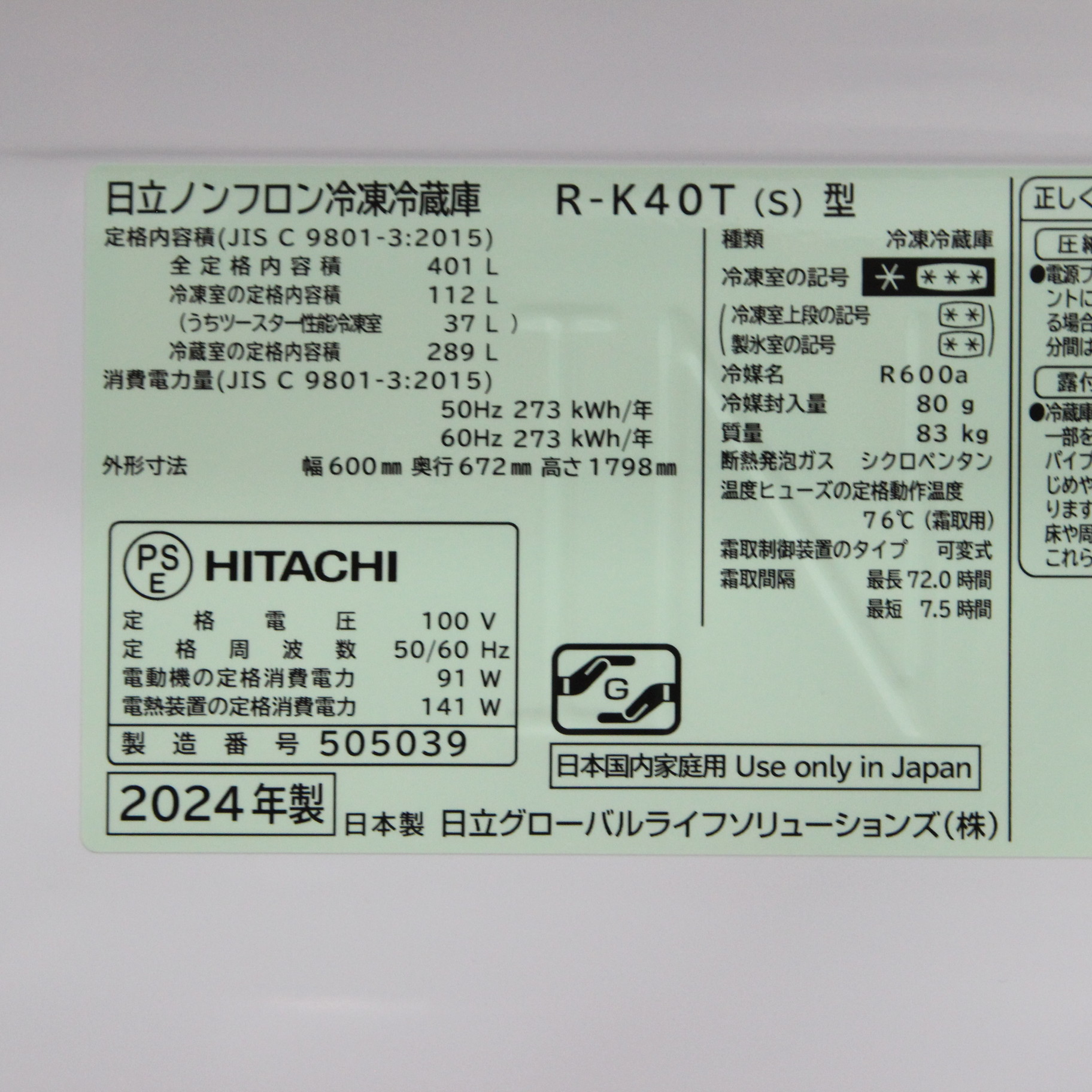 〔展示品〕 冷蔵庫 Kタイプ シルバー R-K40T-S [幅60cm /401L /5ドア /右開きタイプ /2023年]