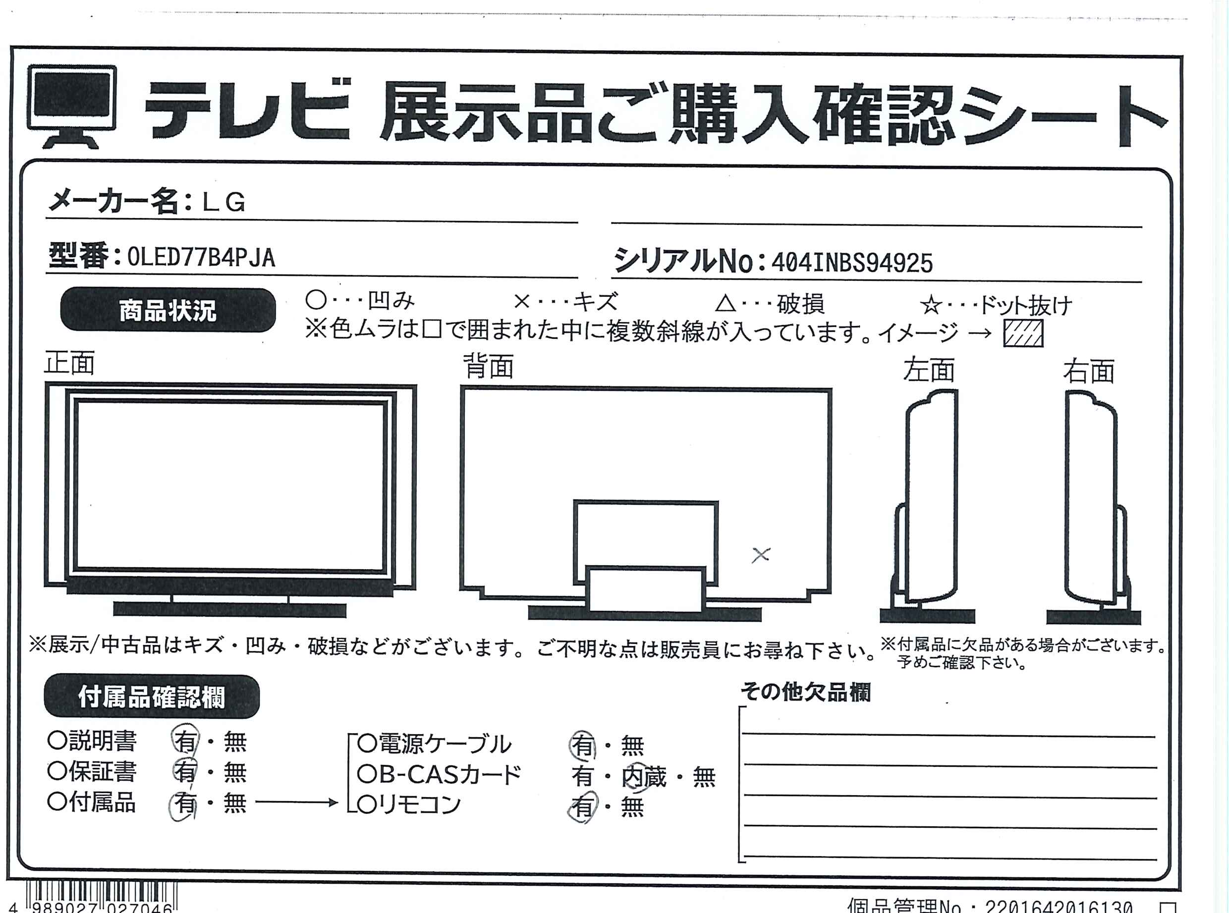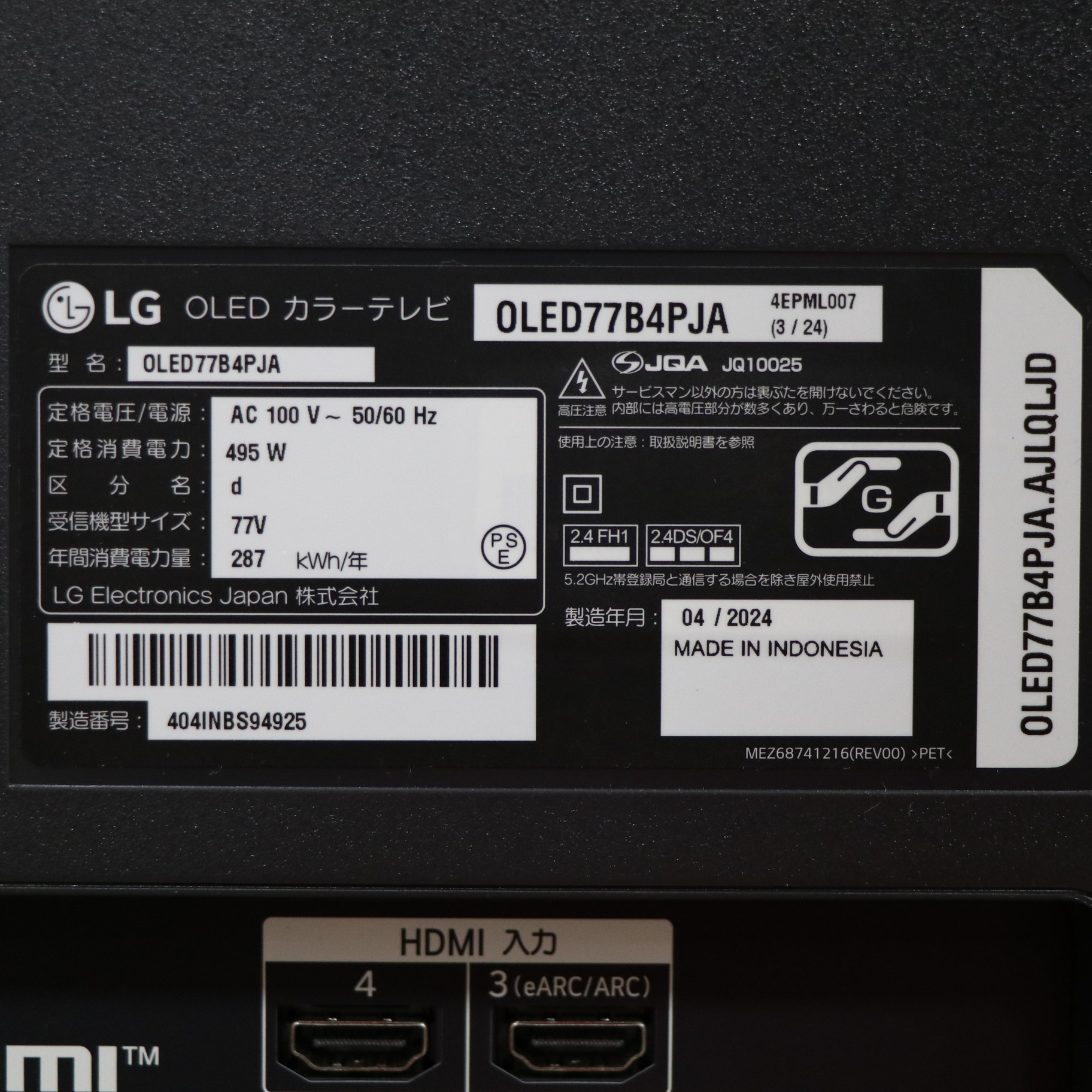 〔展示品〕 有機ELテレビ OLED77B4PJA [77V型 /Bluetooth対応 /4K対応 /BS・CS 4Kチューナー内蔵 /YouTube対応]