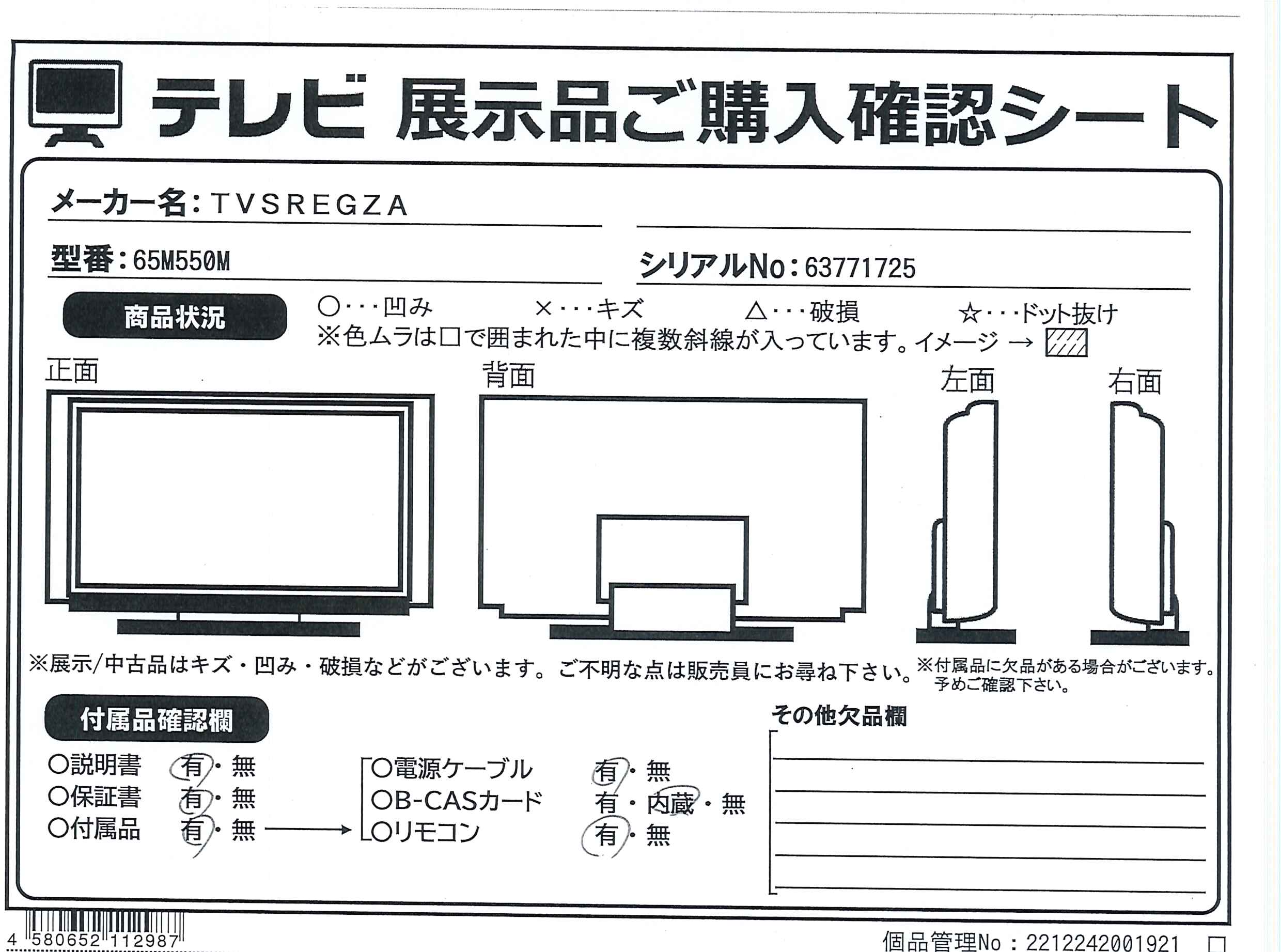 中古商品ランクについて 付属品・商品状態について 〔付属品〕説明書、スタンド×2、スタンド用ネジ×4、リモコン、単四型乾電池×2、電源コード、ネジ(長)×2、ネジ(短)×2、転倒防止バンド×2