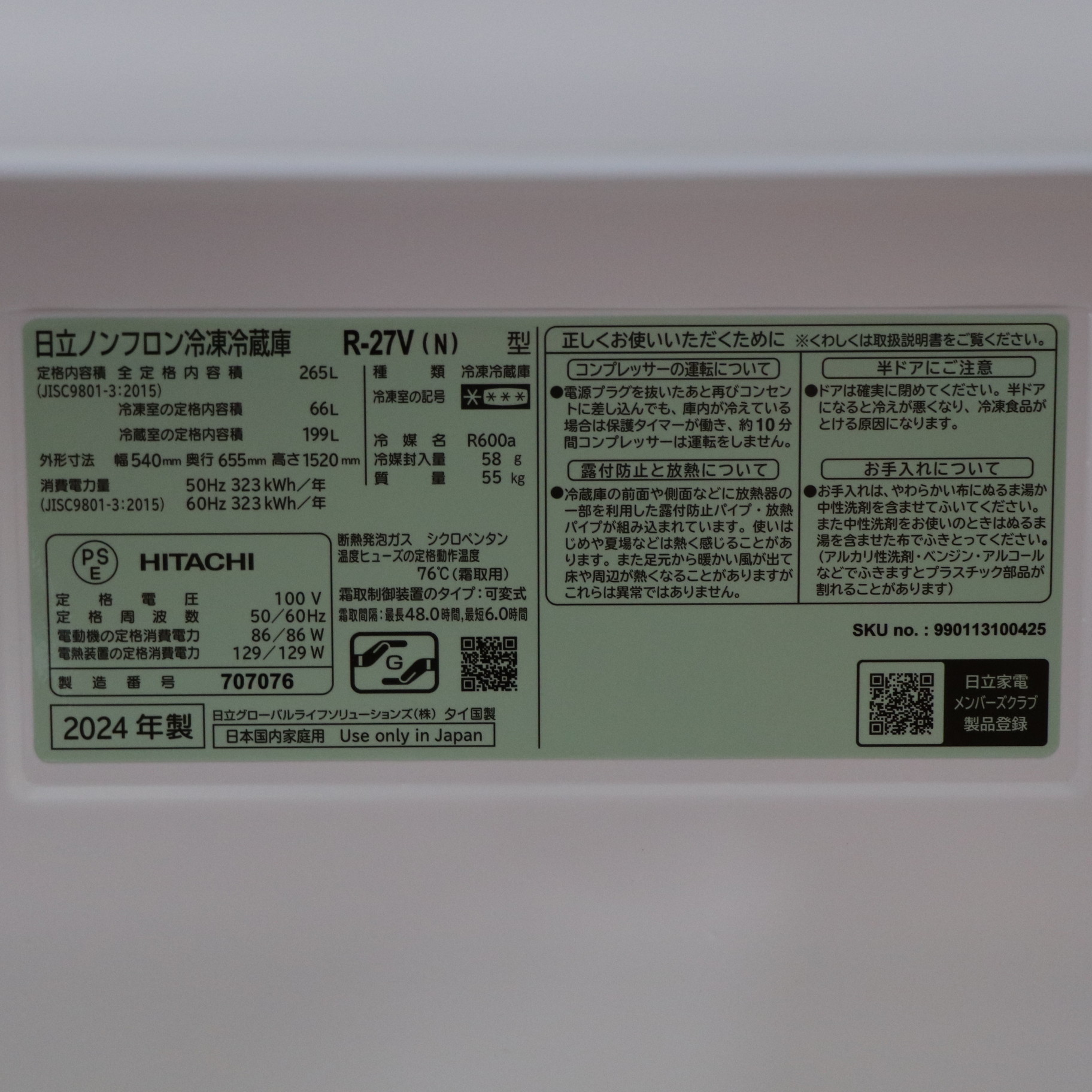 〔展示品〕 冷蔵庫 ライトゴールド R-27V-N [幅54cm /265L /3ドア /右開きタイプ /2024年]