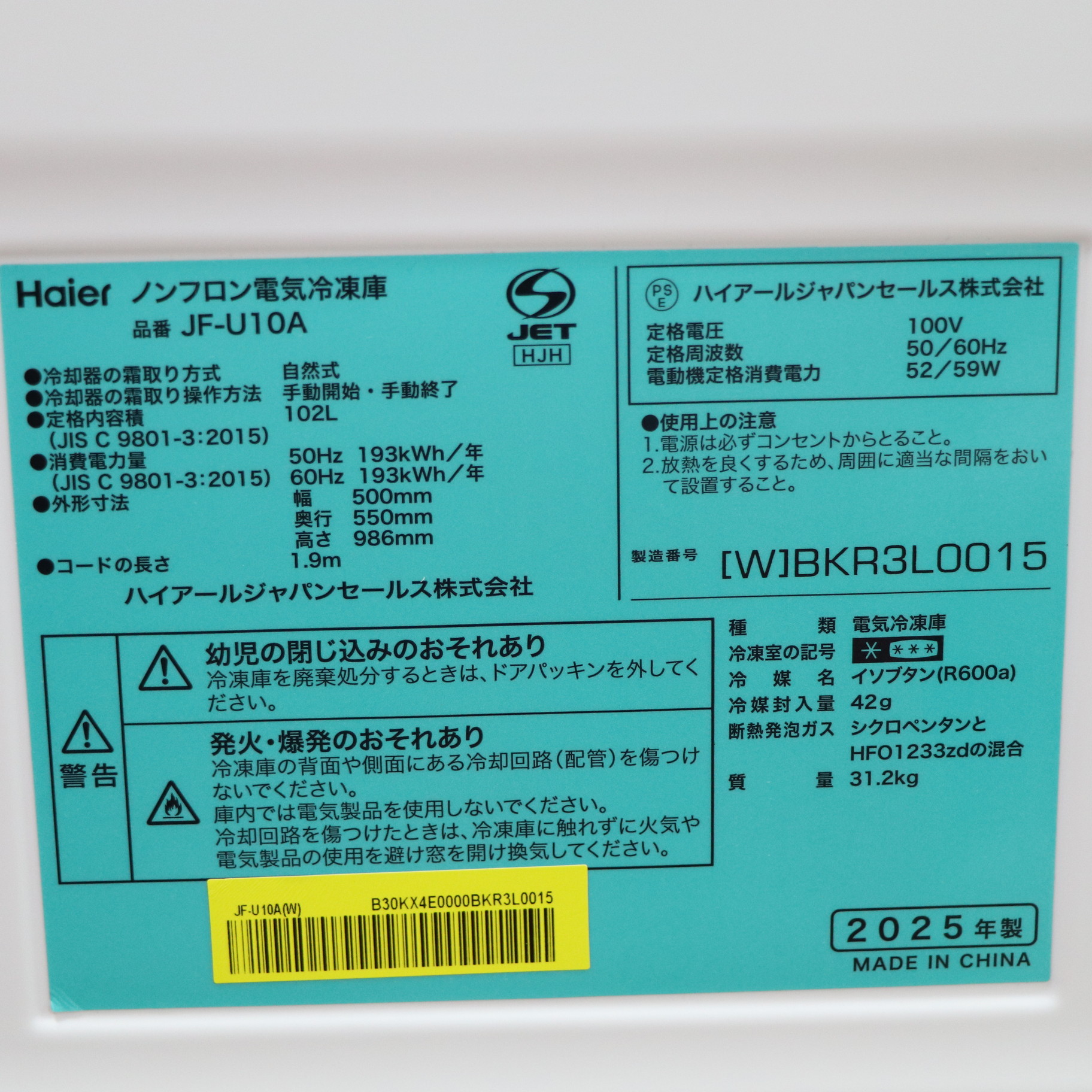 〔展示品〕 冷凍庫 ホワイト JF-U10A-W [幅50cm /102L /1ドア /右開きタイプ]