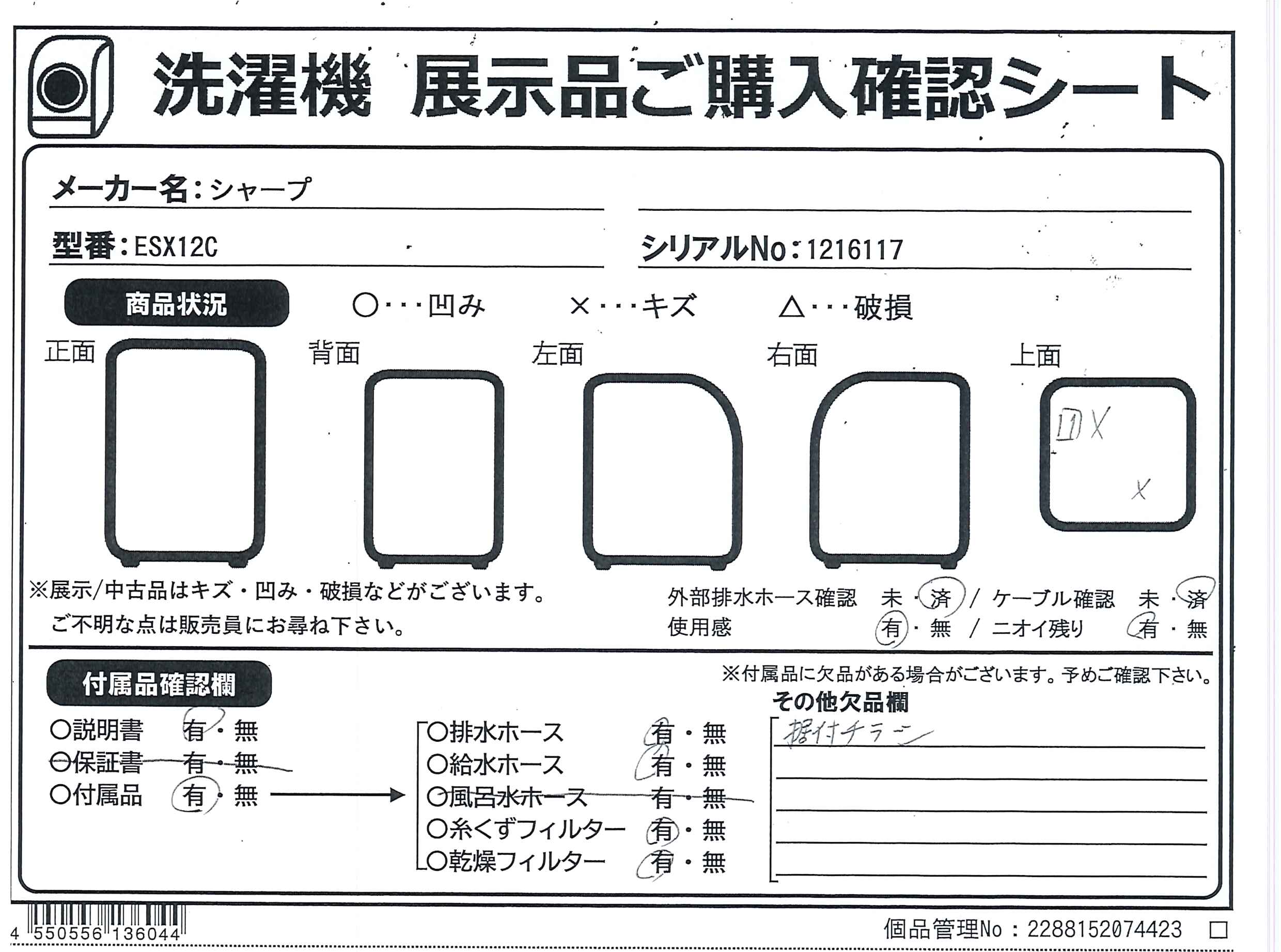 中古商品ランクについて 付属品・商品状態について 〔付属品〕取扱説明書、シャープクラウドサービスガイド、洗剤ご使用ガイド、洗濯キャップ、給水ホース、水栓つぎて、外部ホース、ホースクリップ、水準器、輸送用固定ねじ(上用×2・下用×2)、ビスシート(2枚入り×2)