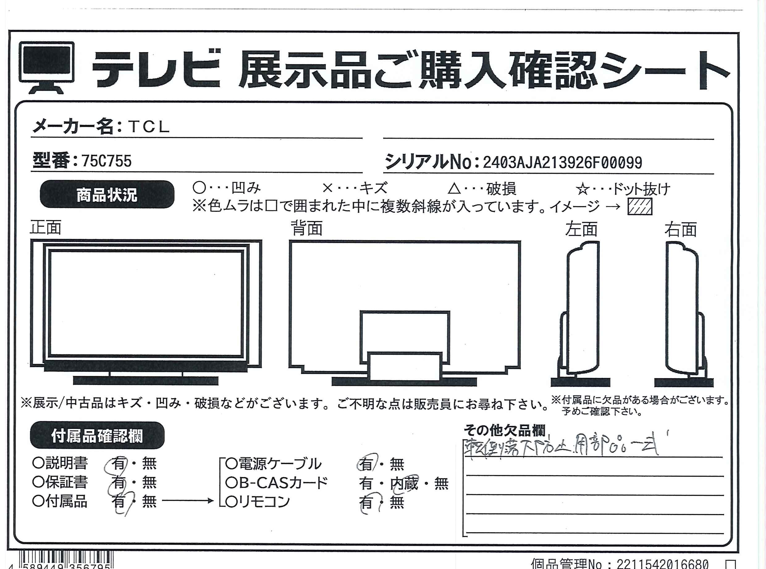 ▼同型番の新品商品はこちら![]() TCL(ティーシーエル) 液晶テレビ 75C755 [75V型 /Bluetooth対応 /4K対応 /BS・CS 4Kチューナー内蔵 /YouTube対応] ¥178,000(税込) 17,800ポイントサービス お取り寄せ |