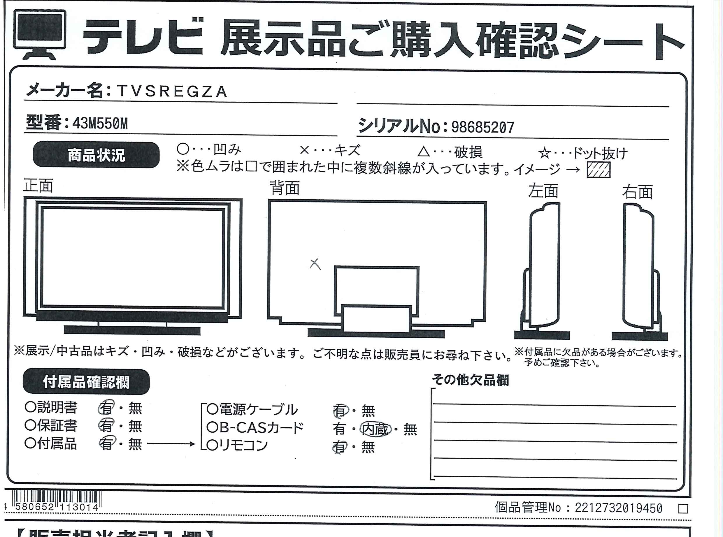 中古商品ランクについて 付属品・商品状態について 〔付属品〕説明書、スタンド取付説明書、スタンド、スタンド取付ネジX4、リモコン、リモコン用乾電池、転倒防止バンドX2、ネジ(長)X2、ネジ(短)X2、電源コード