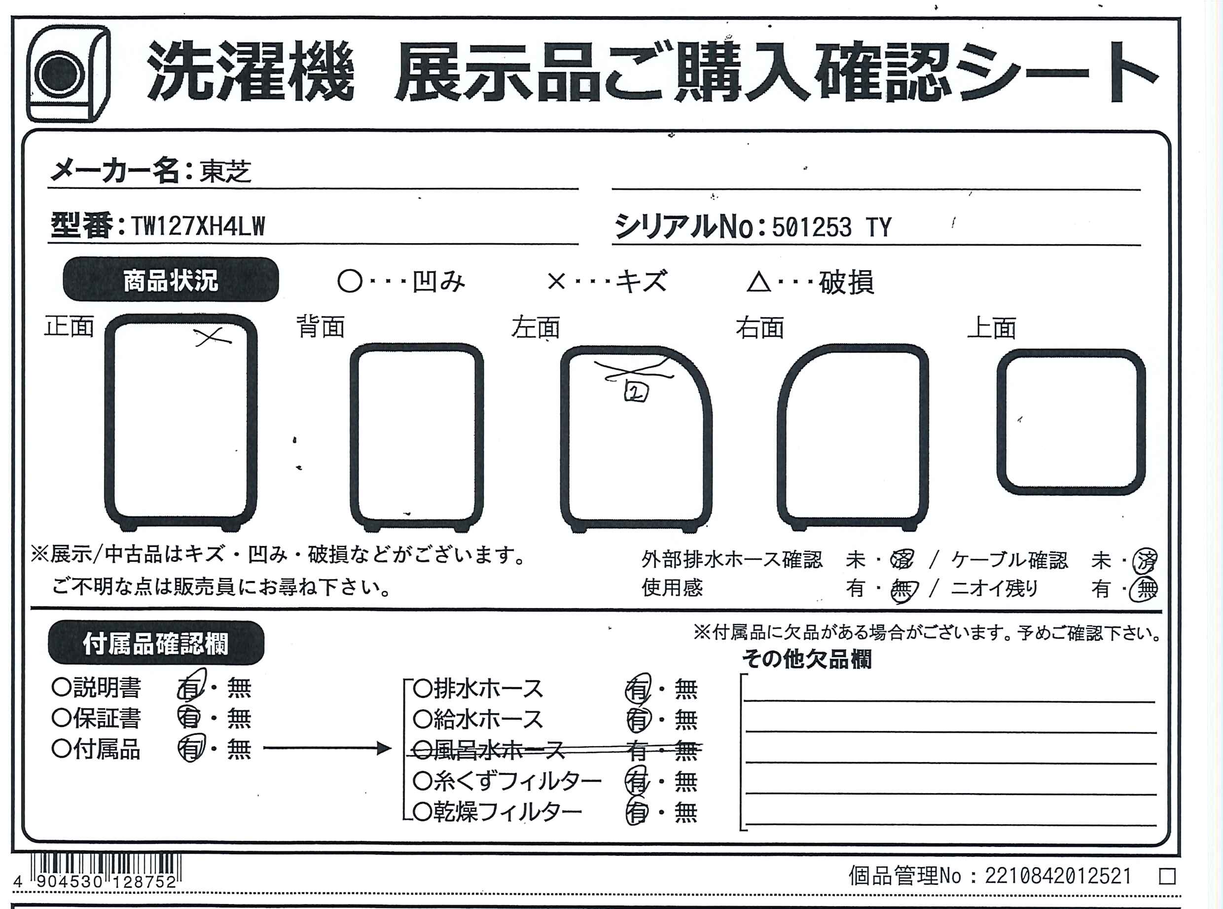中古商品ランクについて 付属品・商品状態について 〔付属品〕取扱説明書、据付説明書、工具、ねじセット(安全カバー付き)×4、給水ホース、ホースキャップ、排水ホースバンド×2、ホース継手、お手入れブラシ、輸送用ボルト×4
