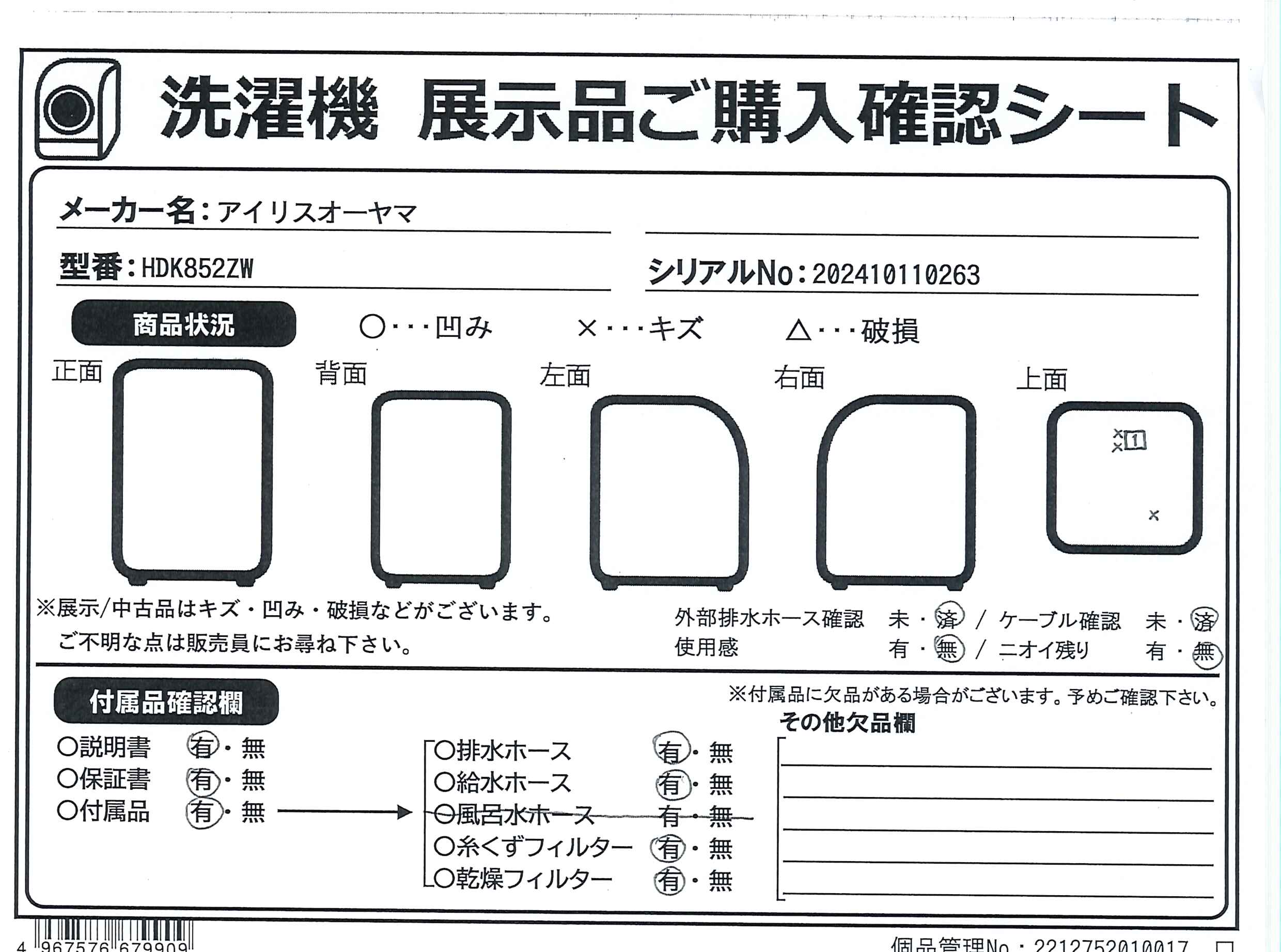 中古商品ランクについて 付属品・商品状態について 〔付属品〕説明書(かんたん操作ガイド)、据付説明書、給水ホース、排水ホース、ホースクリップ、輸送用固定ねじ4本、輸送用固定ねじ穴キャップ4個、スパナ、接続口キャップ