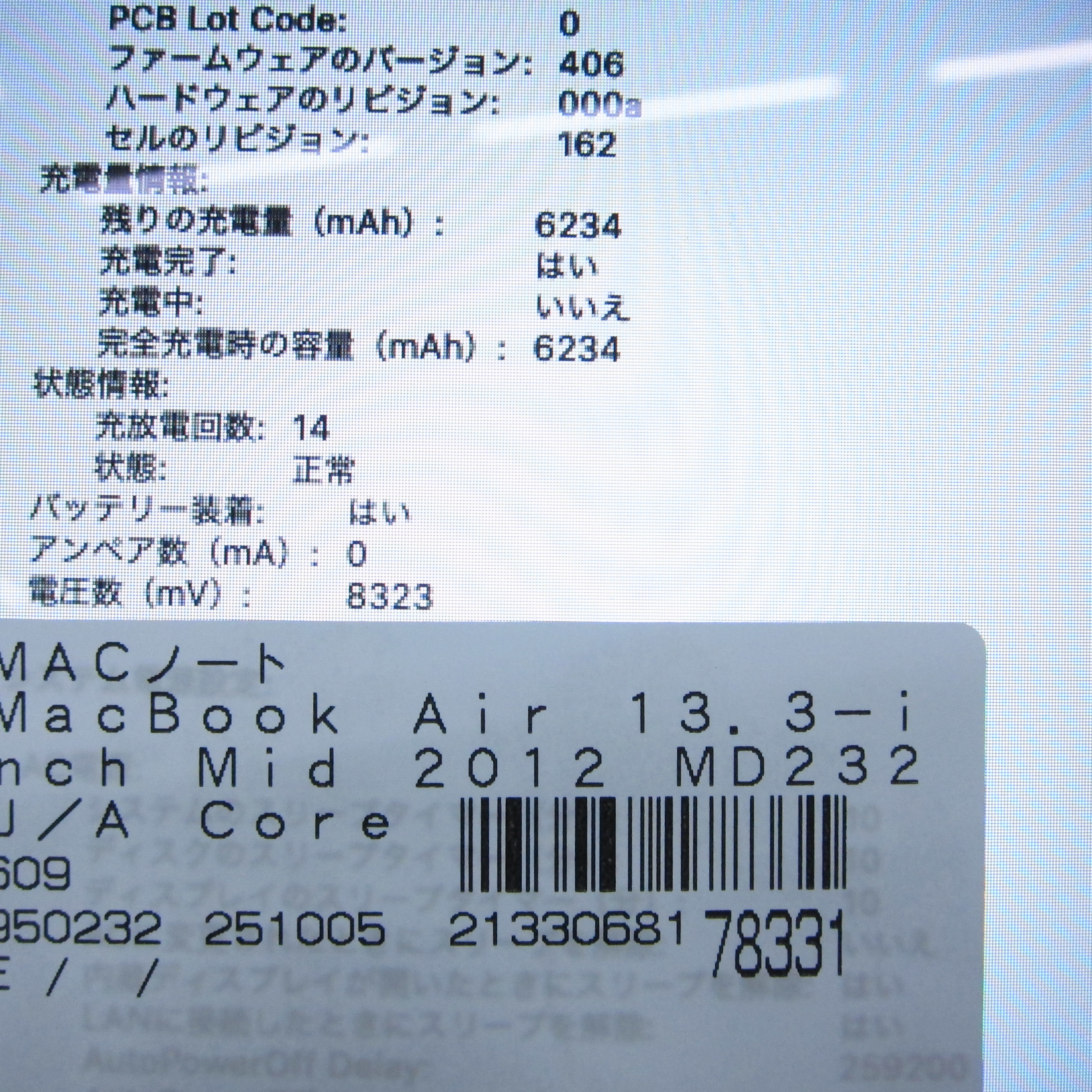 〔中古品(難あり)〕 MacBook Air 13.3-inch Mid-2012 MD232J/A Core_i7 2GHz 8GB SSD256GB 〔10.15 Catalina〕 [グラフィック:Intel HD Graphics 4000/JISキーボード]