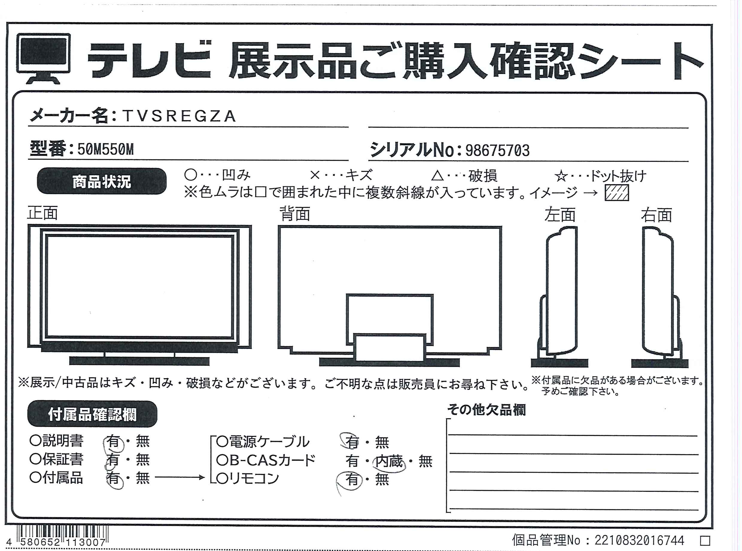 中古商品ランクについて 付属品・商品状態について 〔付属品〕説明書、スタンド一式、リモコン、単四形乾電池×2、電源コード、転倒防止バンド一式