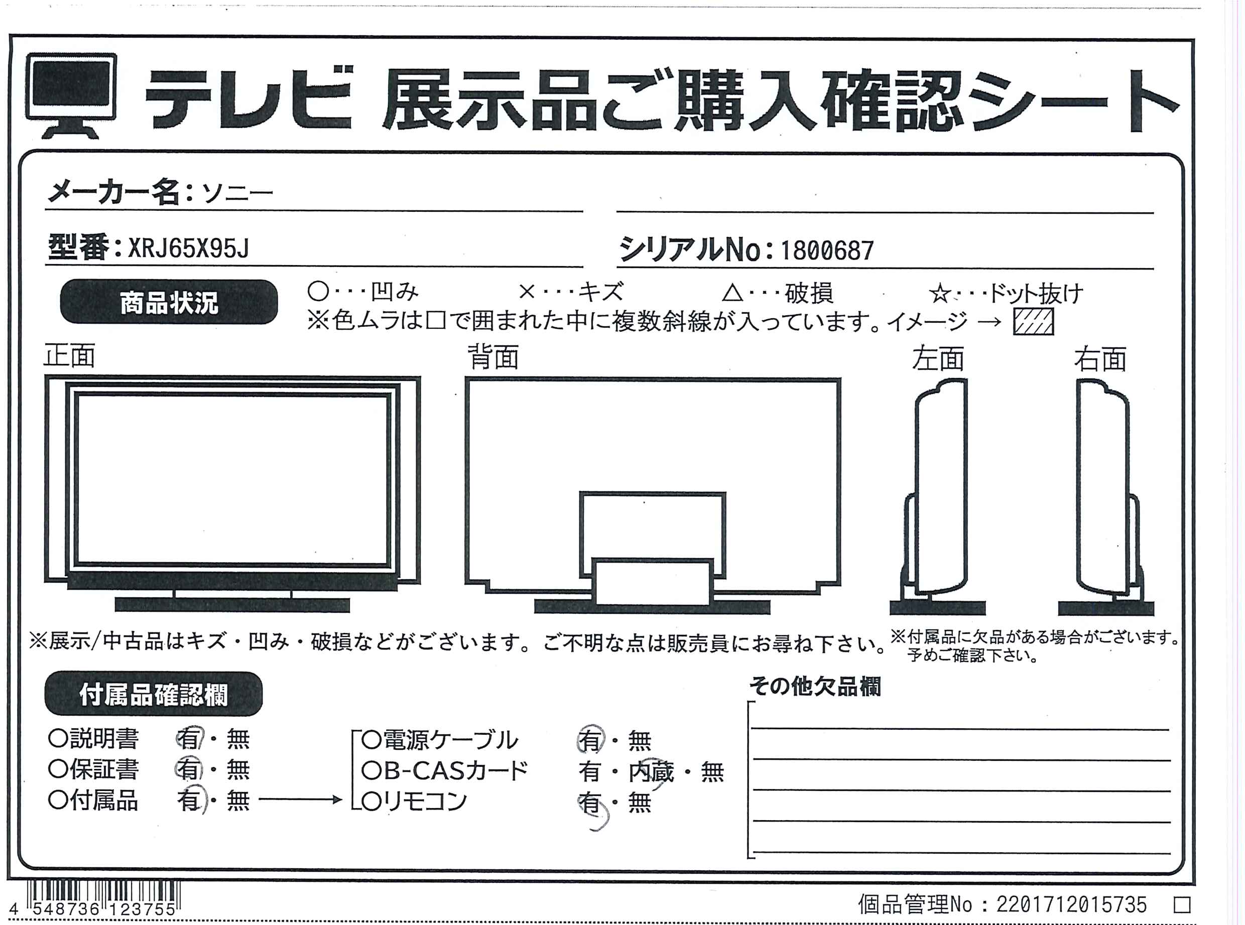 中古商品ランクについて 付属品・商品状態について 〔付属品〕取扱説明書、組み立て設置ガイド、Google TV セットアップガイド、製品登録のおすすめ、リモコン、スタンド一式、転倒防止用ベルト一式(FB)、単四型乾電池×2、背面パネル(CA)、背面パネル(CB)、背面パネル(CC)、背面パネル(CD1)、背面パネル(CD2)