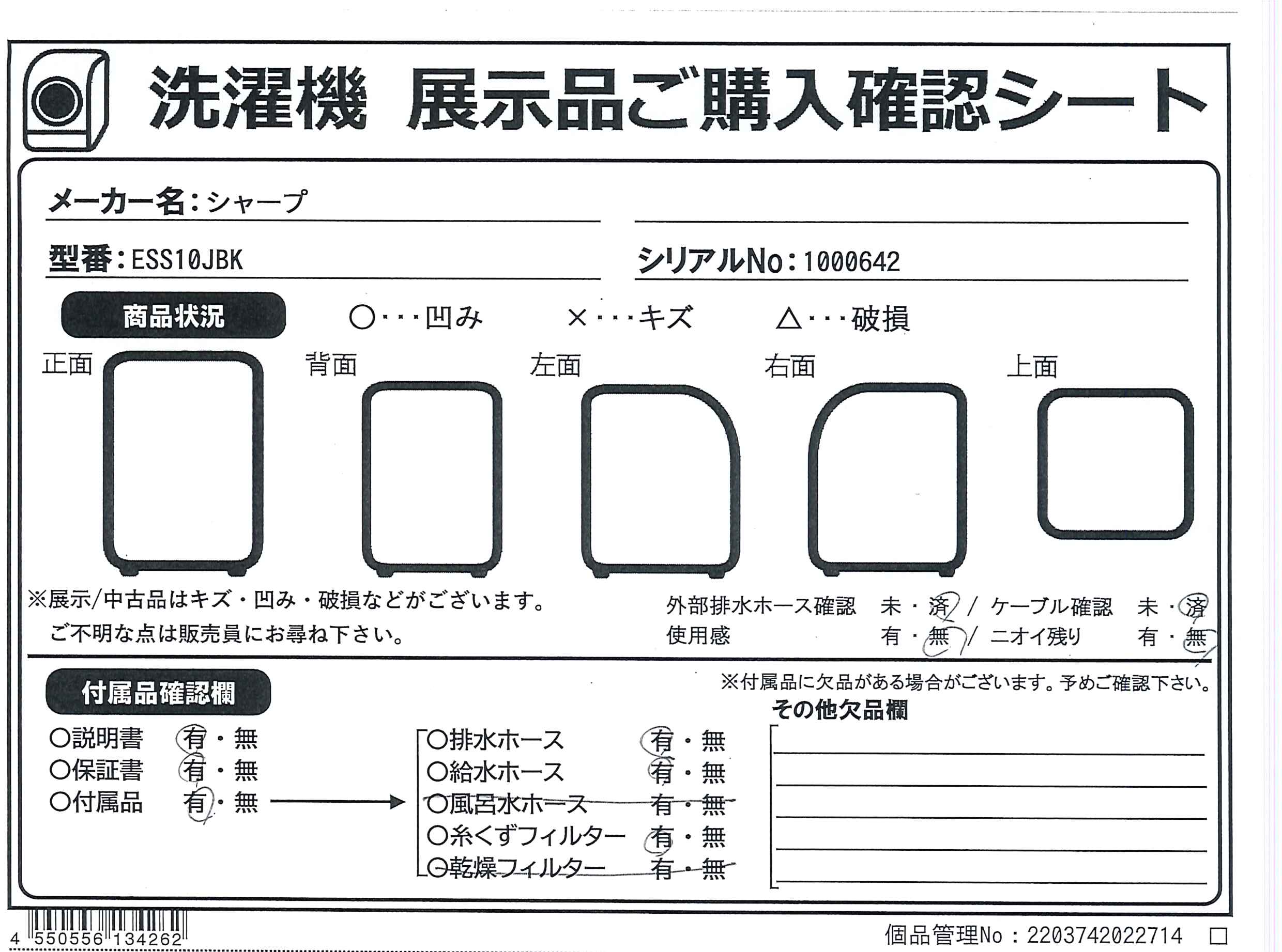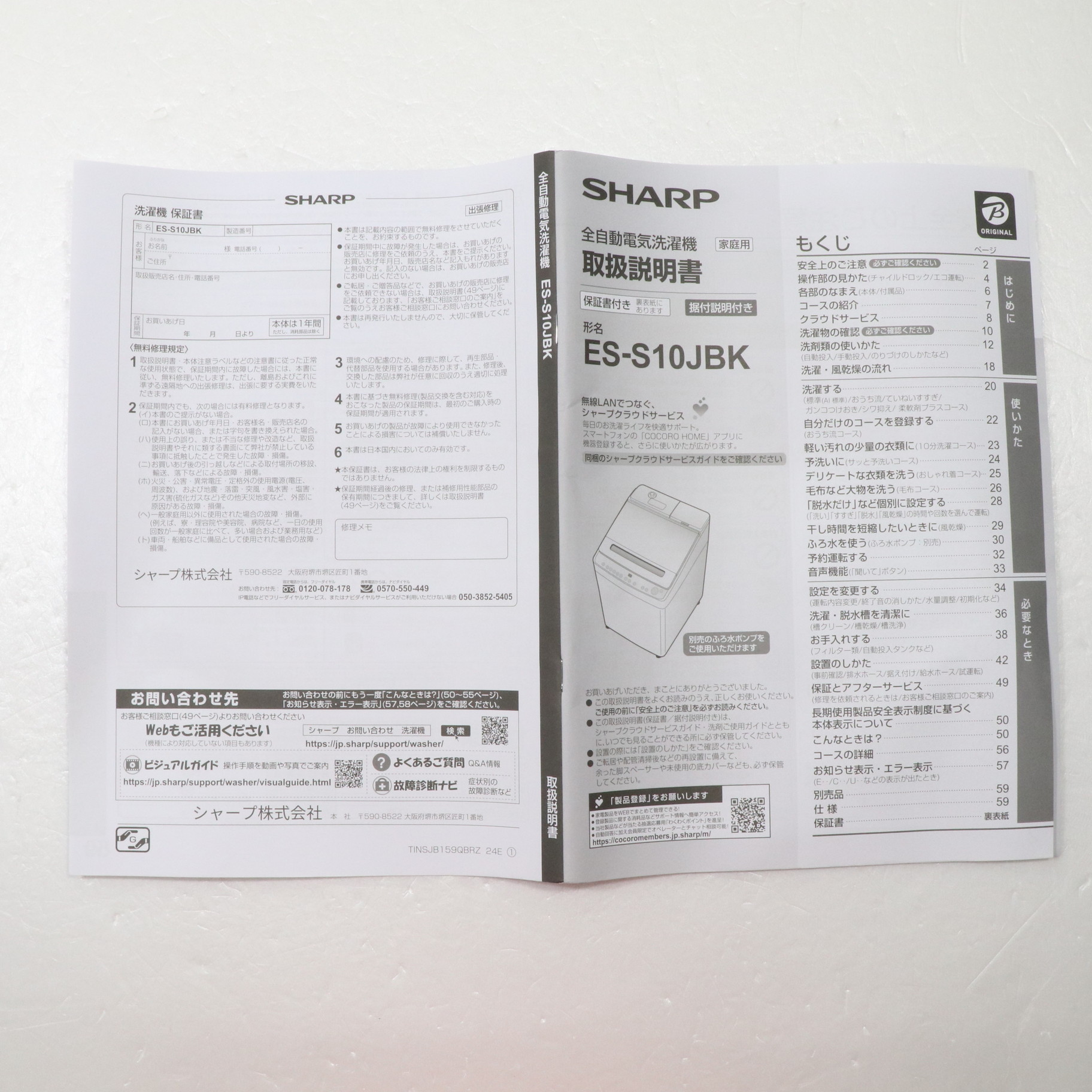 中古商品ランクについて 付属品・商品状態について 〔付属品〕説明書、洗剤ご使用ガイド、シャープクラウドサービスガイド、据付チラシ、給水ホース、水栓つぎて、柔軟剤タンク、液体洗剤タンク、脚スペーサー(6mm・接着テープ)各2、底カバー、底カバー取付ねじX6、底カバー取付説明書