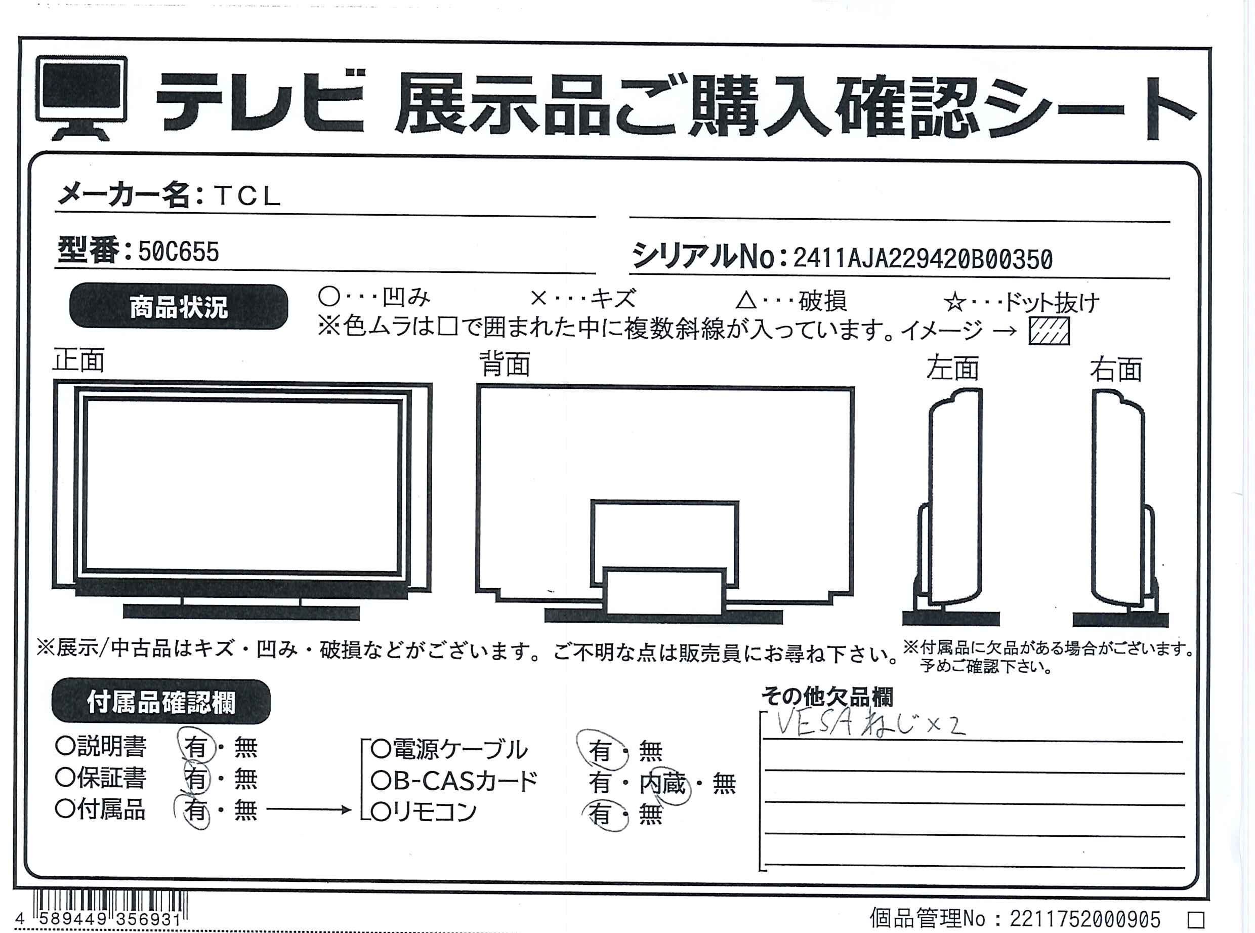 中古商品ランクについて 付属品・商品状態について 〔付属品〕取扱説明書、かんたんガイド、リモコン、リモコン用乾電池×2、電源コード、スタンド一式、マジックテープ×2、ネジ(ST4)(20mm)、クリップ×3