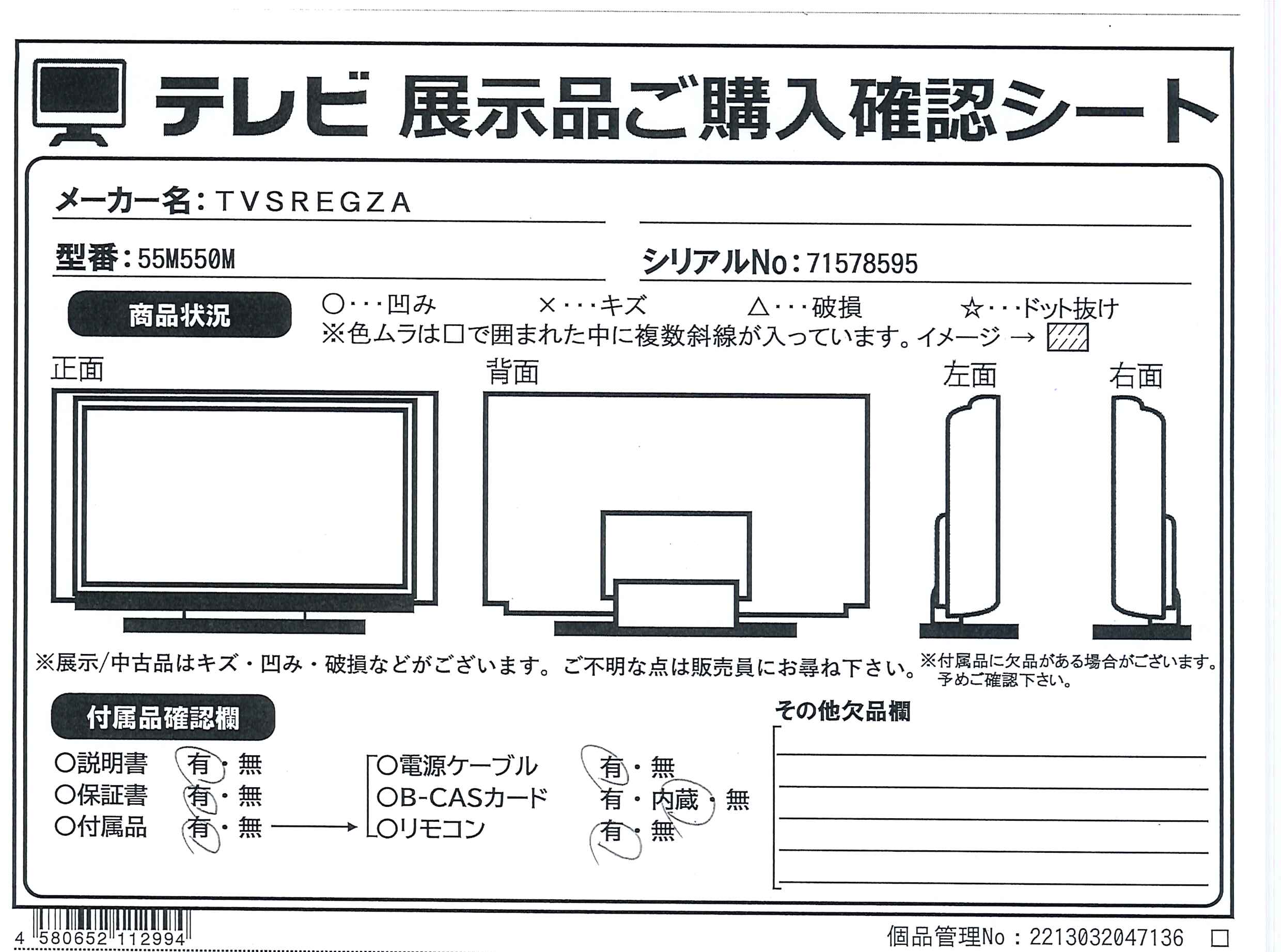 中古商品ランクについて 付属品・商品状態について 〔付属品〕説明書、スタンド、スタンドM5ネジ×4、リモコン、乾電池×2、電源コード、転倒防止バンド×2、転倒防止ネジ(長)×2、転倒防止ネジ(短)×2