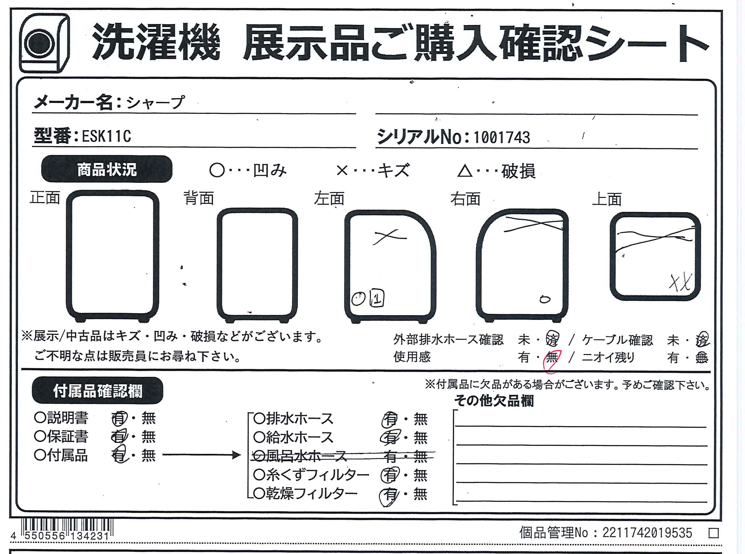 中古商品ランクについて 付属品・商品状態について 〔付属品〕取扱説明書、据付チラシ、給水ホース、水準器、輸送用固定ねじ×2、輸送用固定ねじ取り外しスパナ、ビスシート、水栓つぎて