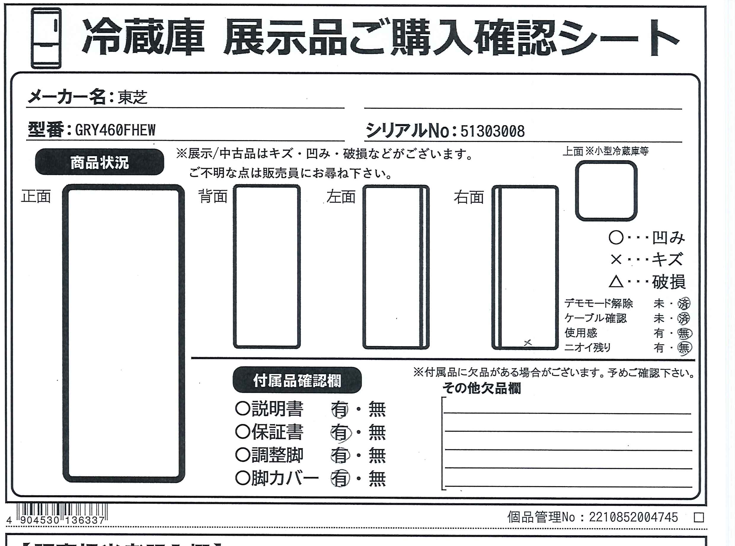 中古商品ランクについて 付属品・商品状態について 〔付属品〕説明書、t調整脚、前面グリル、調整脚用工具、仕切れるチューブスタンド、卵スタンド、アルミトレイ(チルド)、おそうじ口のフタ、アルミトレイ、野菜冷凍マット、給水タンク、アイスシャベル