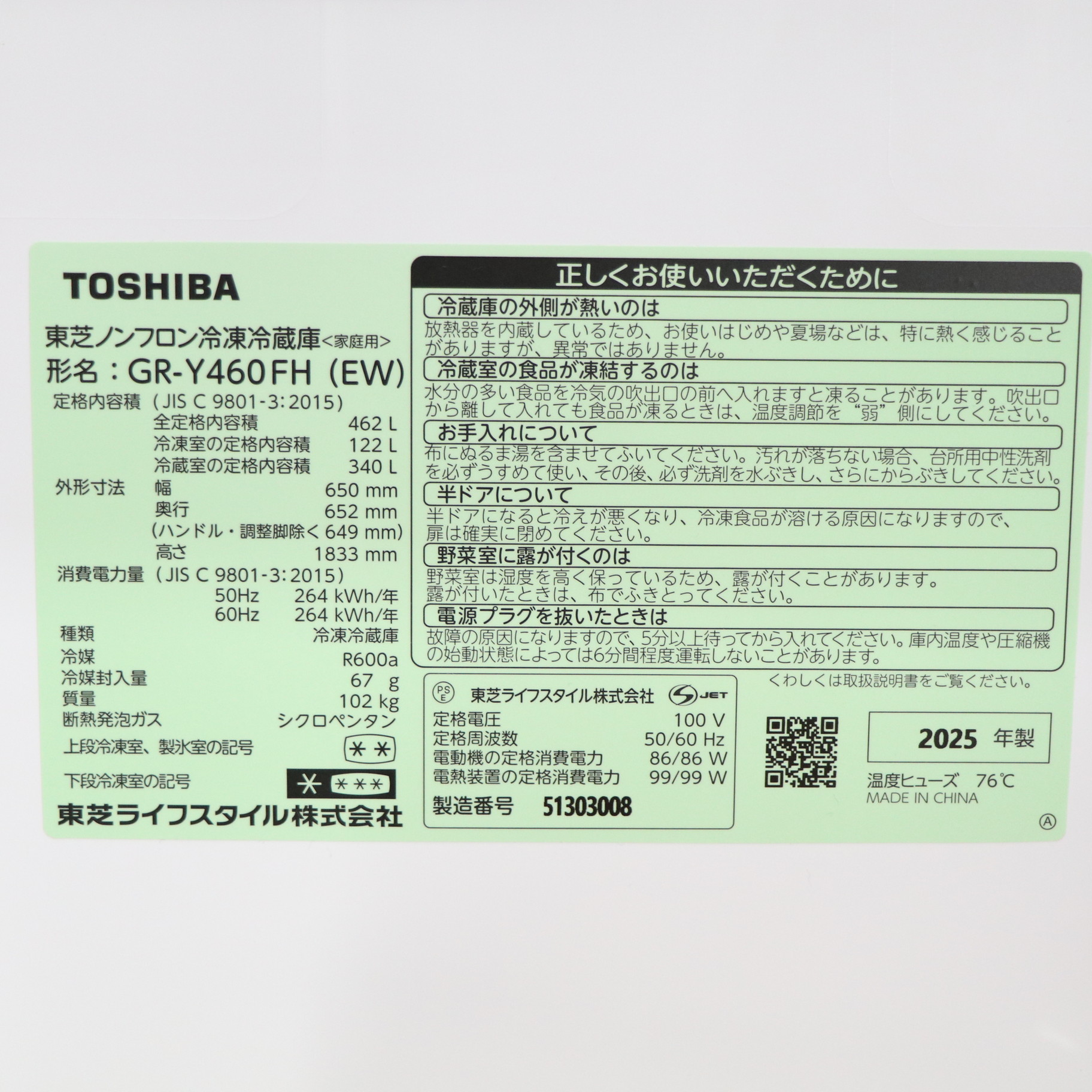 〔展示品〕 冷蔵庫 グランホワイト GR-Y460FH-EW [幅65cm /462L /6ドア /観音開きタイプ /2025年]