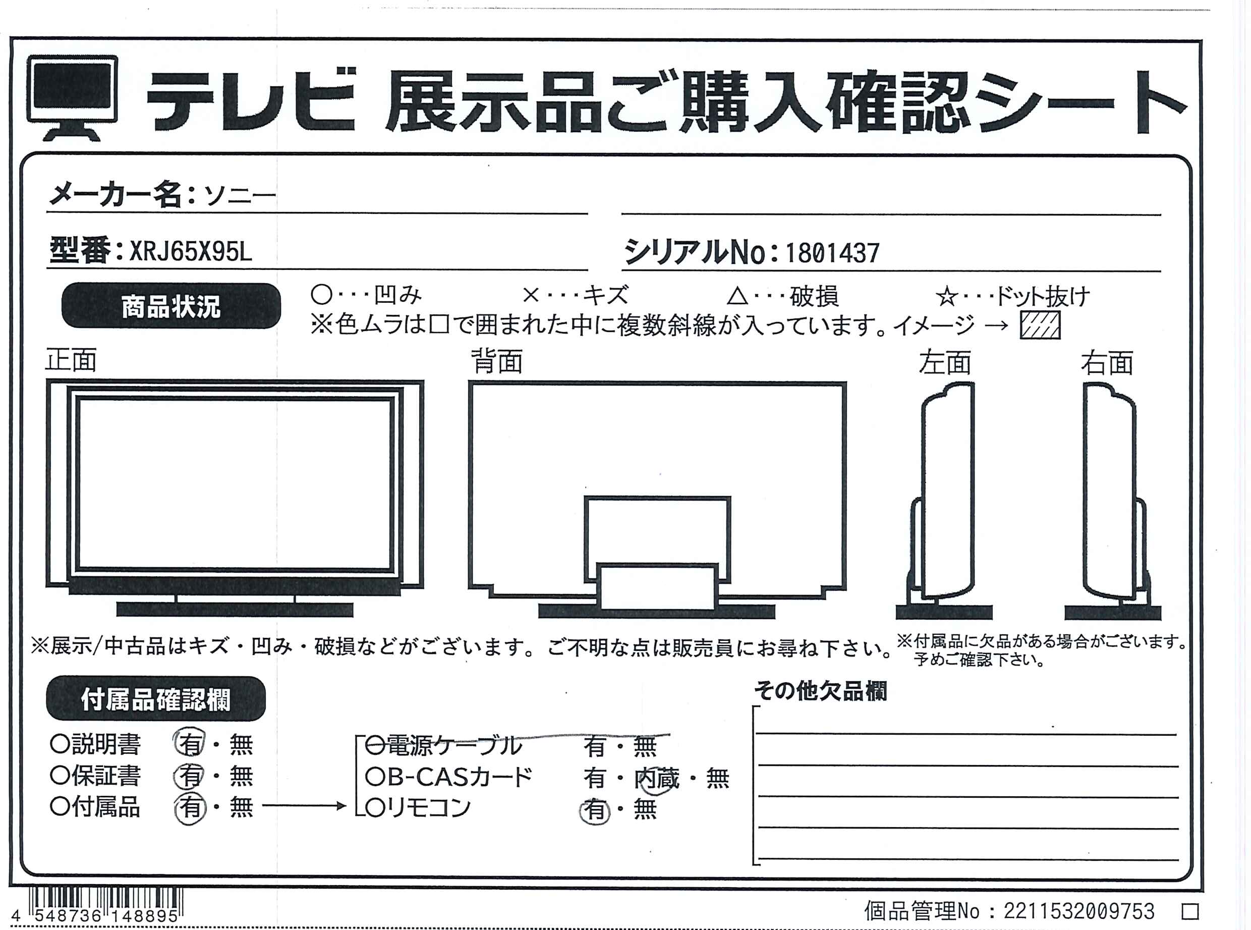 商品名 〔展示品〕 液晶テレビ BRAVIA(ブラビア) XRJ-65X95L [65V型 /Bluetooth対応 /4K対応 /BS・CS 4Kチューナー内蔵 /YouTube対応]