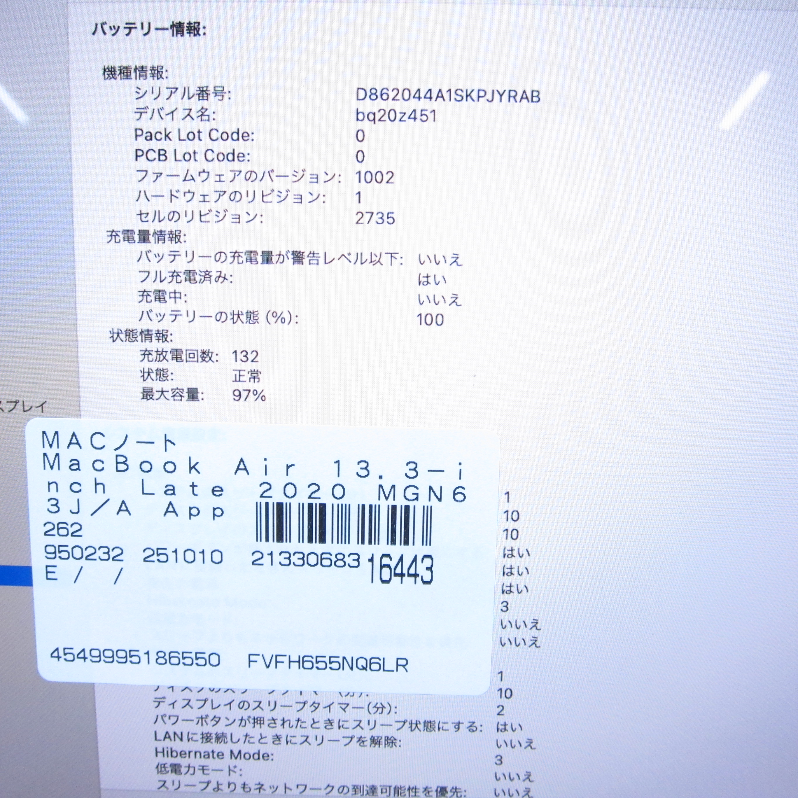 〔中古品〕 MacBook Air 13.3-inch Late-2020 MGN63J/A Apple M1 8コアCPU_7コアGPU 16GB SSD256GB スペースグレイ 〔14.7 Sonoma〕 [グラフィック:オンボード/USキーボード]