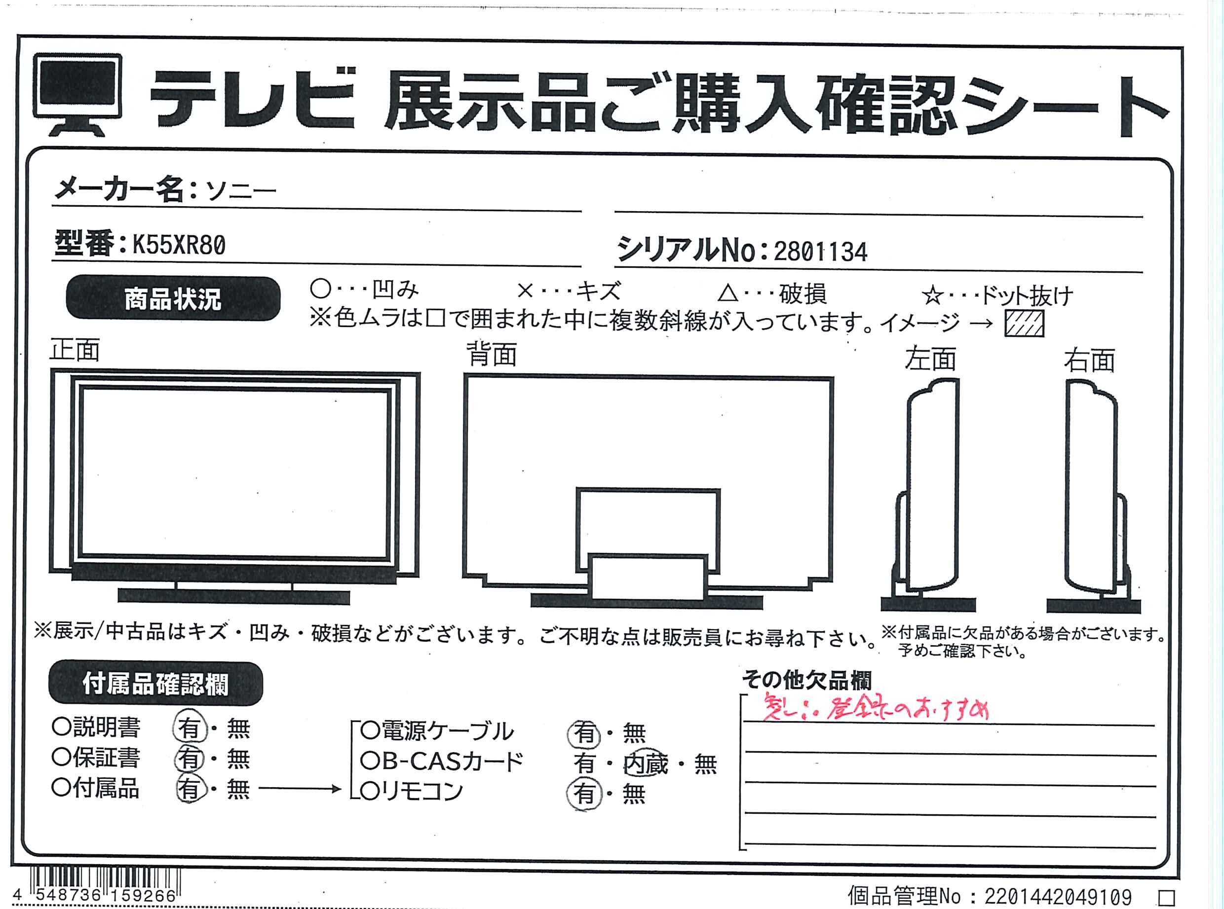 ![SONY(ソニー) 有機ELテレビ BRAVIA(ブラビア) K-55XR80 [55V型 /Bluetooth対応 /4K対応 /BS・CS 4Kチューナー内蔵 /YouTube対応]](https://image.sofmap.com/images/product/large/4548736159266.jpg)