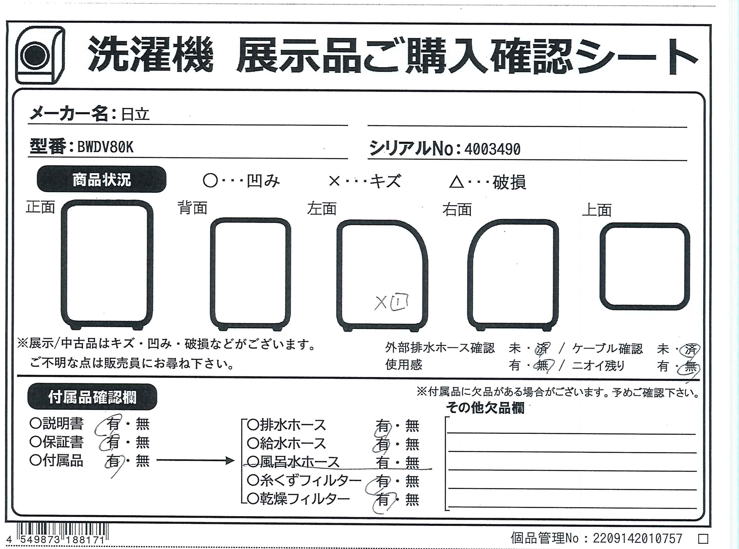 中古商品ランクについて 付属品・商品状態について 〔付属品〕取扱説明書、据付説明書・据付チェックシート、給水ホース