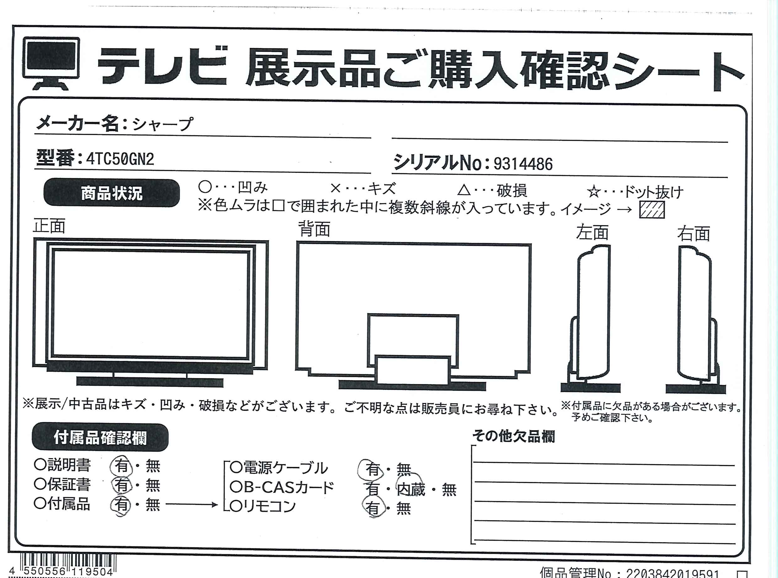 中古商品ランクについて 付属品・商品状態について 〔付属品〕取扱説明書、かんたん使い方ガイド、リモコン、リモコン用単4形乾電池×2、スタンドベース、スタンド取付金具、スタンドカバー、スタンド組立用ネジ×4、スタンド取付用ネジ×4、スタンド回転ロックネジ