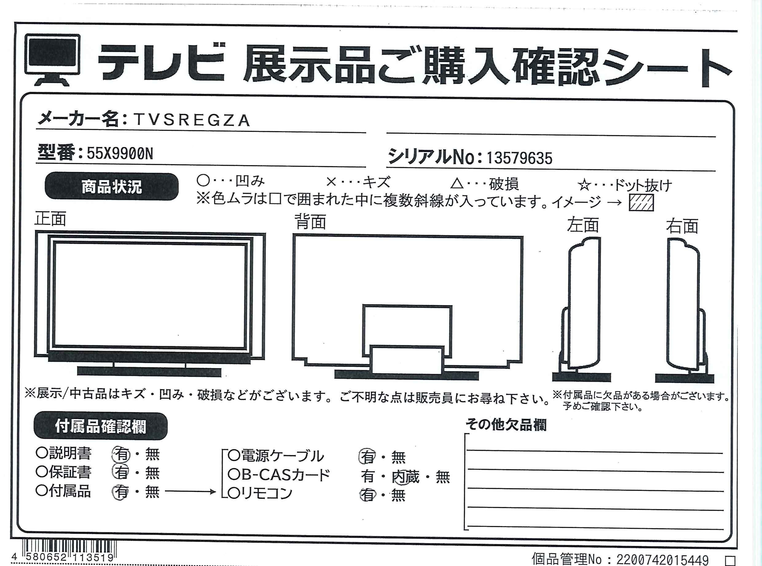 中古商品ランクについて 付属品・商品状態について 〔付属品〕取扱説明書、リモコン、リモコン用乾電池×2、スタンド一式、電源コード、転倒防止バンド一式、コードクランプ、スタンドカバー、背面カバー