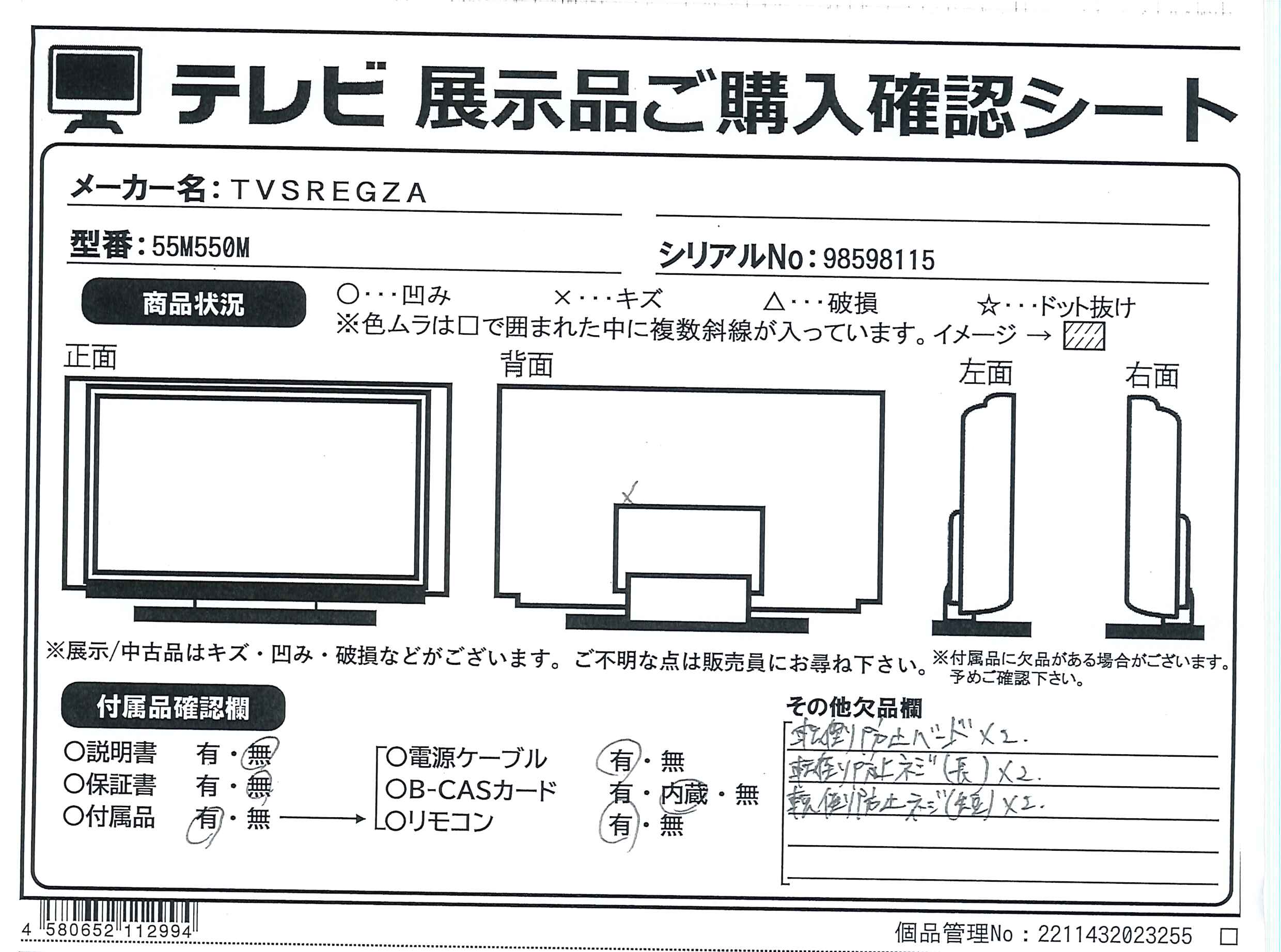 〔欠品〕説明書、転倒防止バンド×2、転倒防止ネジ(長)×2、転倒防止ネジ(短)×2