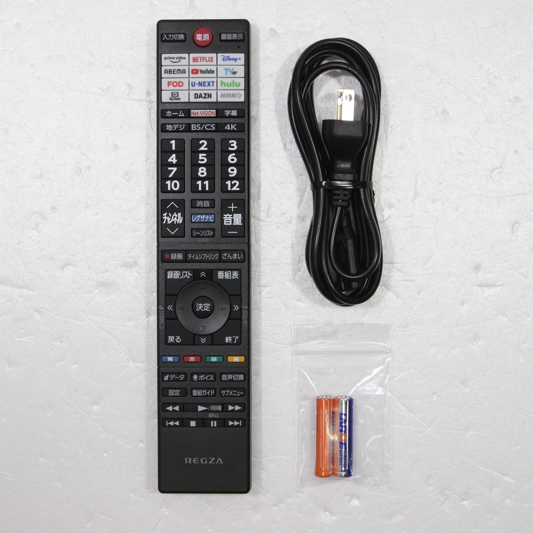 付属品 リモコン1個/単四形乾電池2個/電源コード1本/転倒防止用バンド2本、転倒防止用ネジ(短)2本・ネジ(長) 2本/ 取扱説明書1部 / スタンド取付説明書1部 / レグザメンバーズ登録チラシ1部