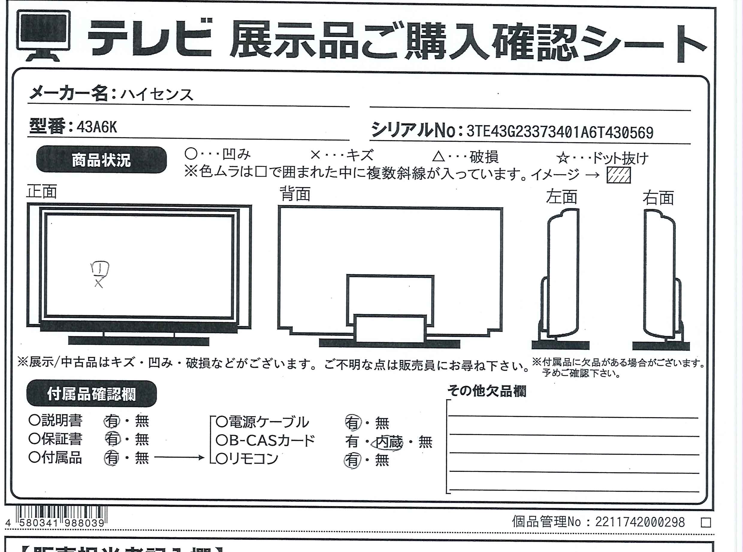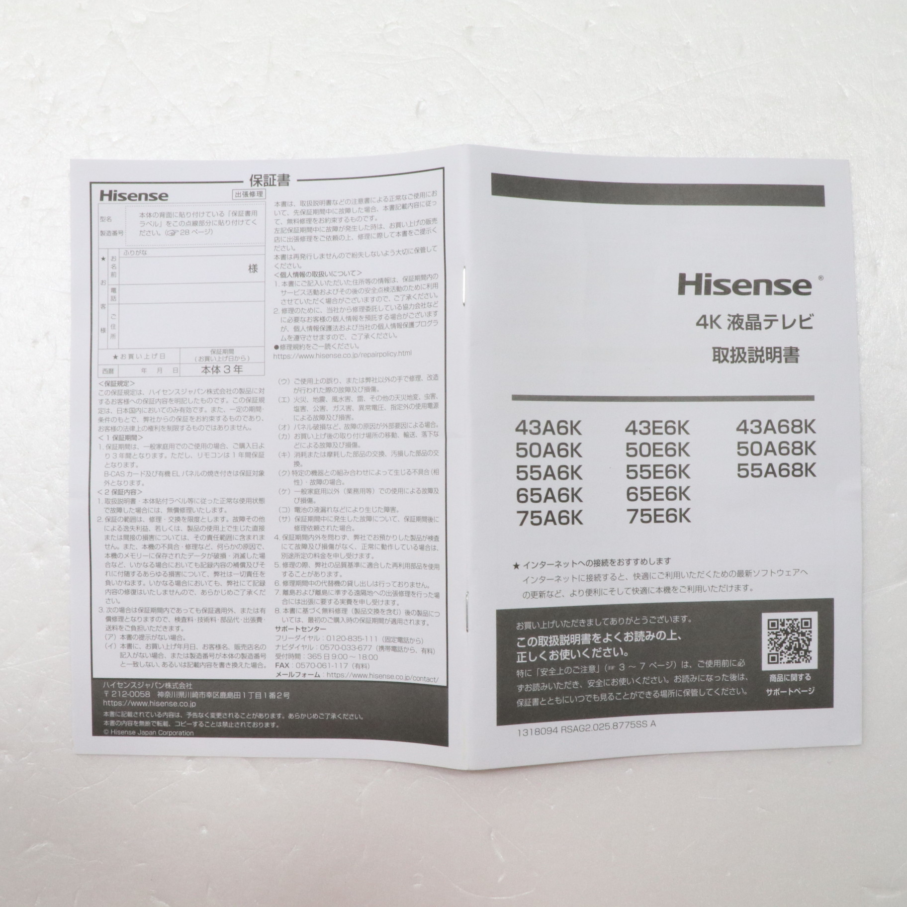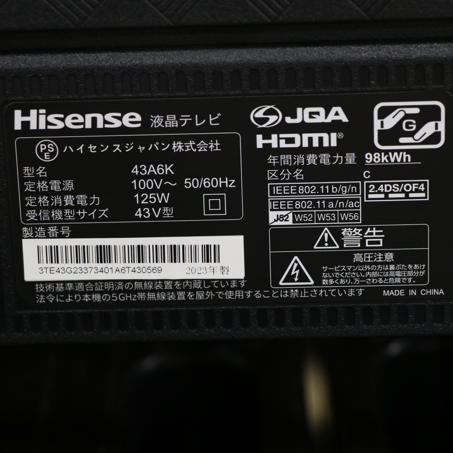 〔展示品〕 液晶テレビ 43A6K [43V型 /Bluetooth対応 /4K対応 /BS・CS 4Kチューナー内蔵 /YouTube対応]