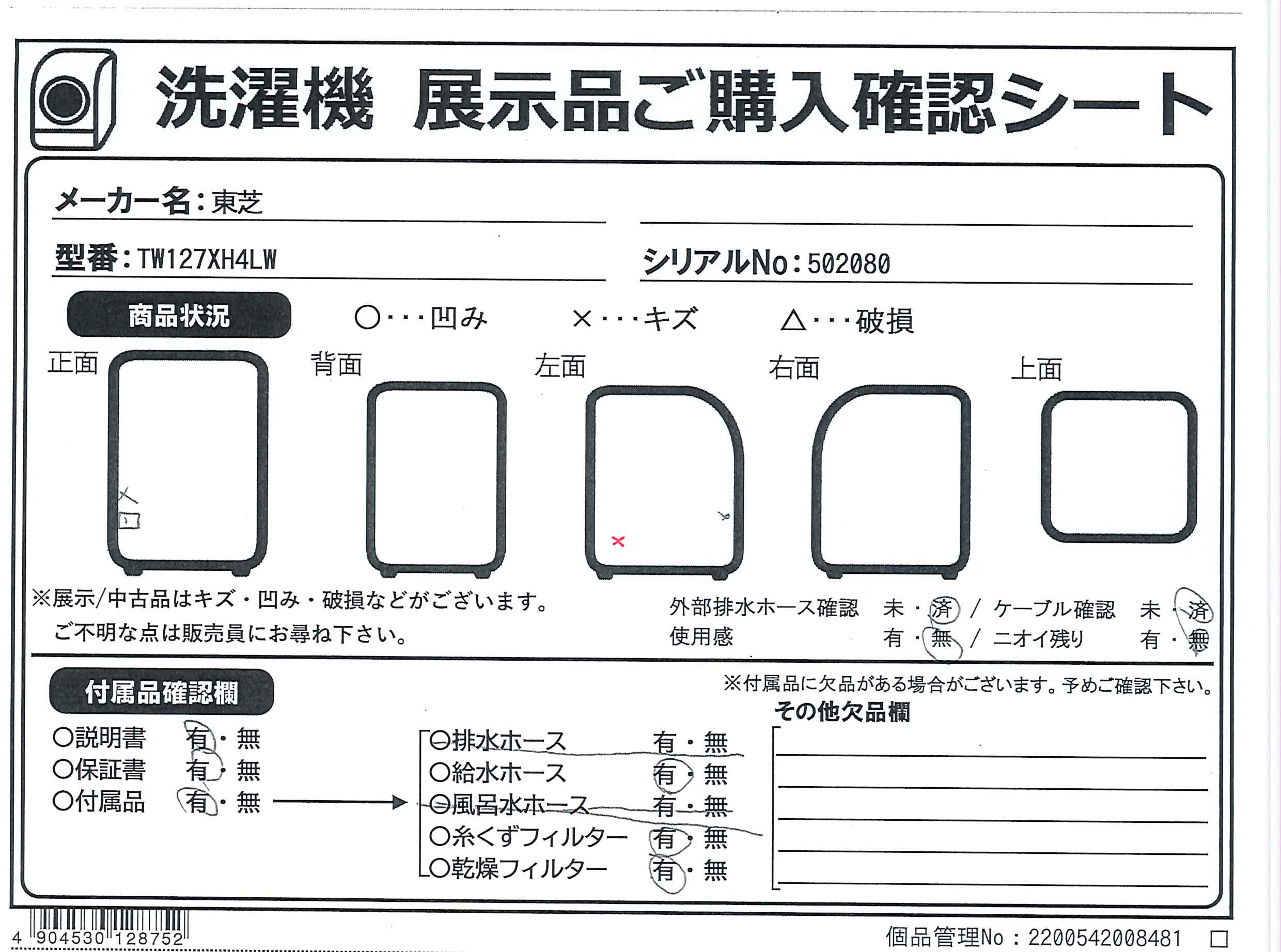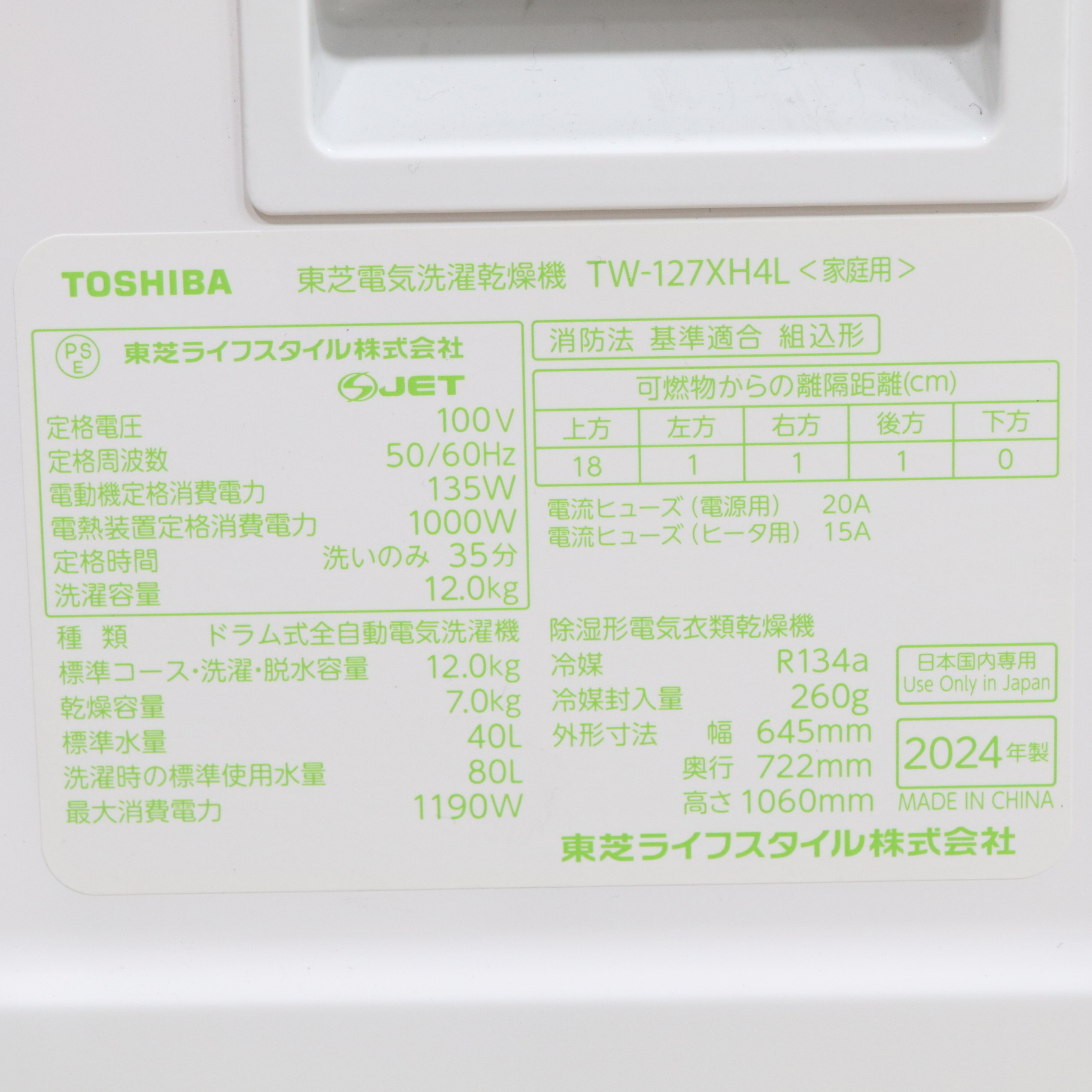 商品名 〔展示品〕 ドラム式洗濯乾燥機 ZABOON グランホワイト TW-127XH4L(W) [洗濯12.0kg /乾燥7.0kg /ヒートポンプ乾燥 /左開き]