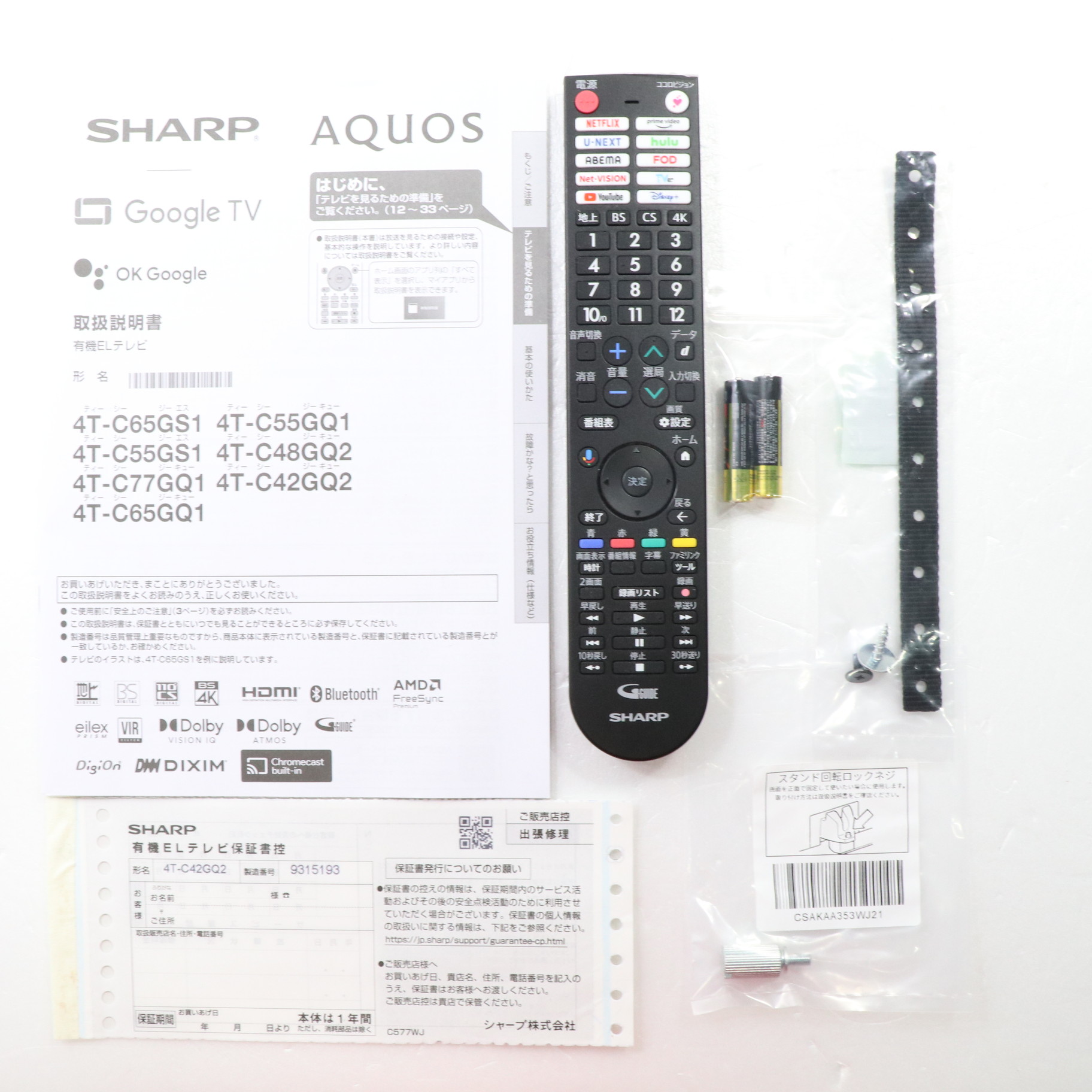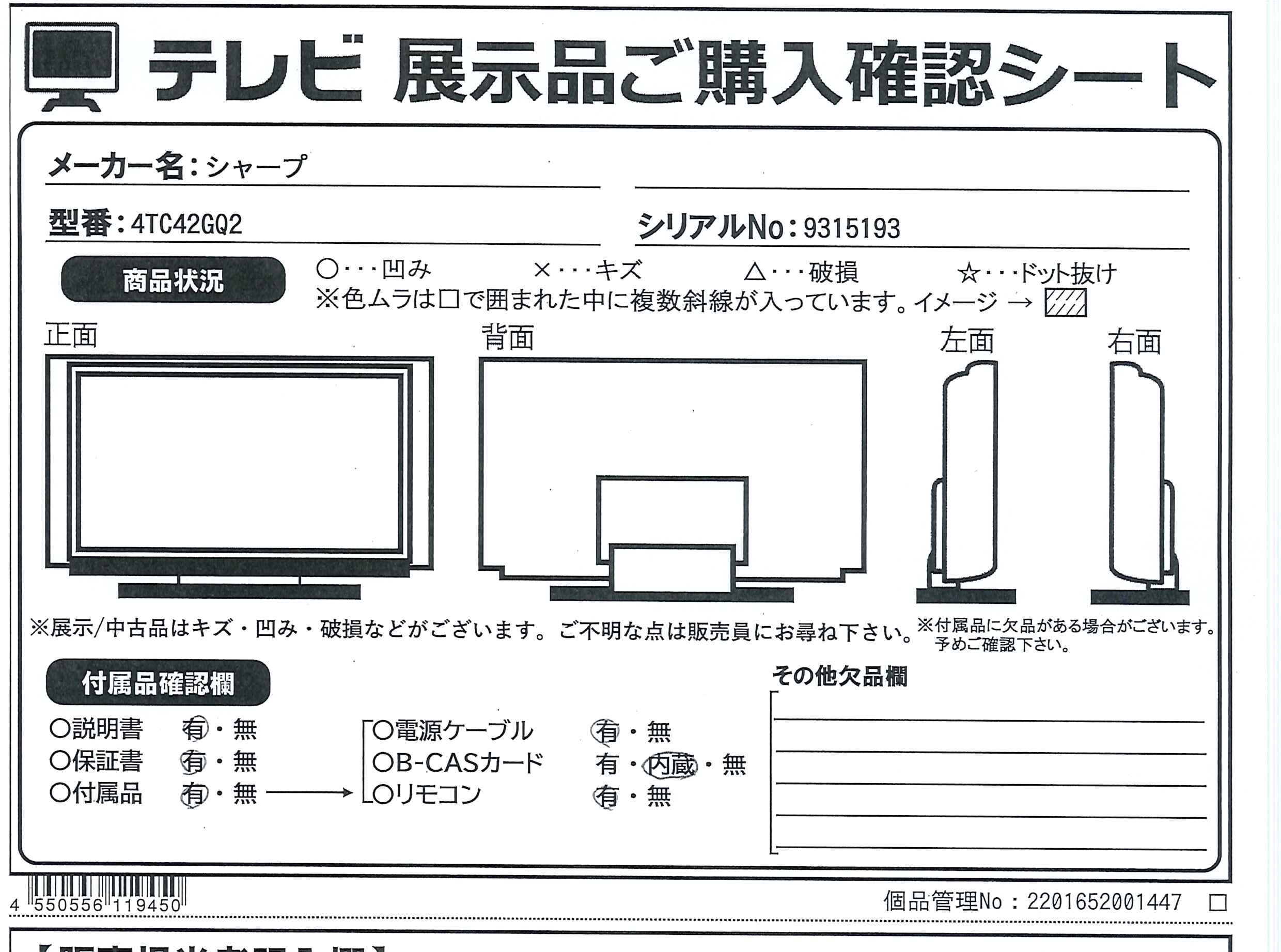 中古商品ランクについて 付属品・商品状態について 〔付属品〕取扱説明書、かんたん使い方ガイド、リモコン、リモコン用単4形乾電池×2、スタンド取付金具、スタンドカバー、スタンドベース、スタンド組立用ネジ×4、スタンド取付用ネジ×4、転倒防止ベルト一式、スタンド回転ロックネジ