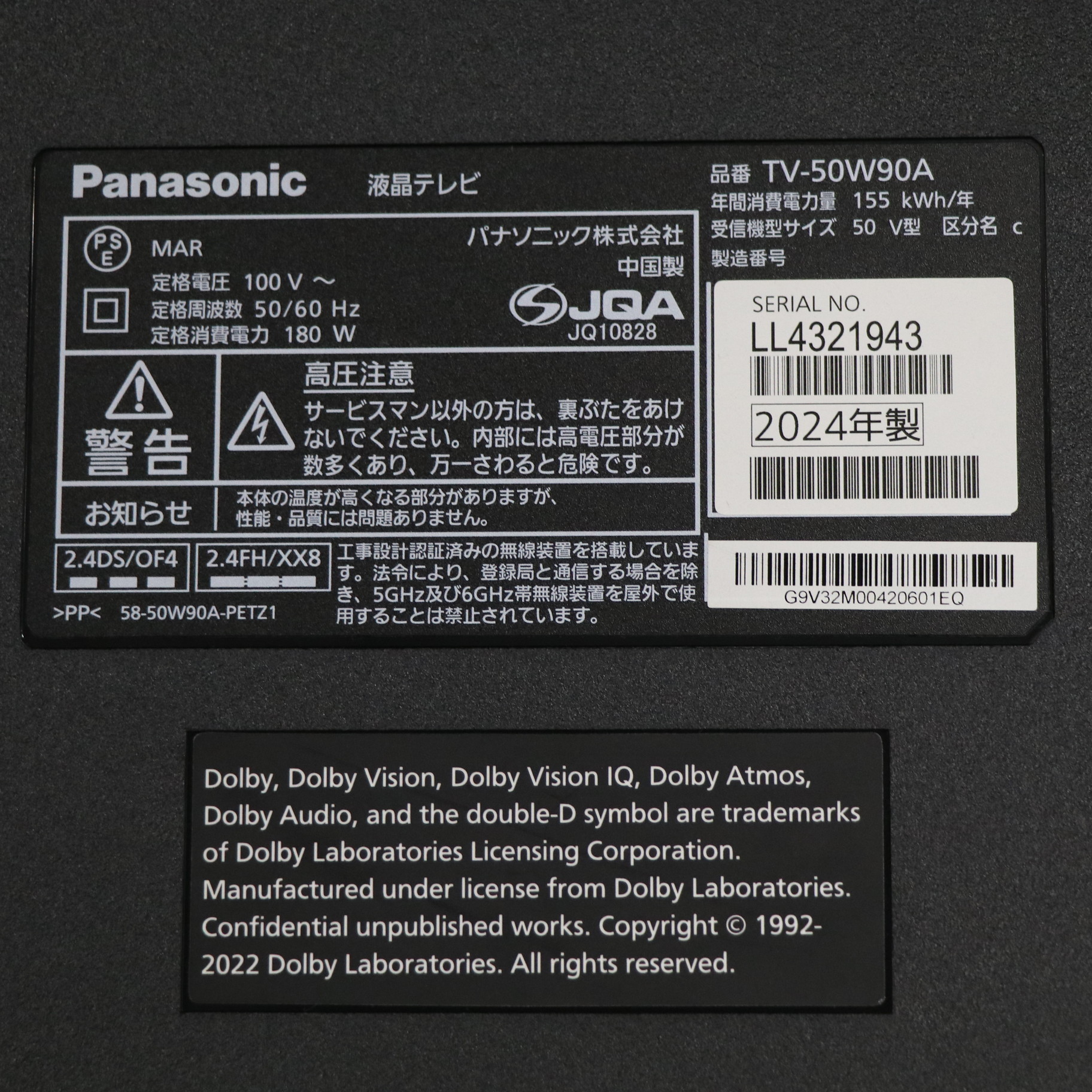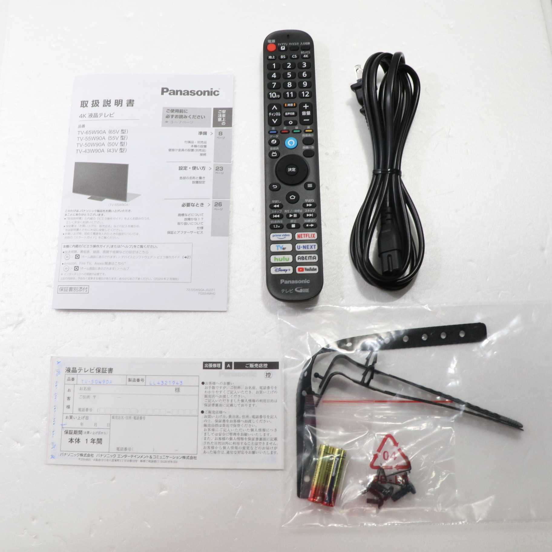 〔付属品〕説明書、リモコン、リモコン用乾電池×2、電源コード、スタンド一式、クランパー×2、転倒・落下防止部品一式
