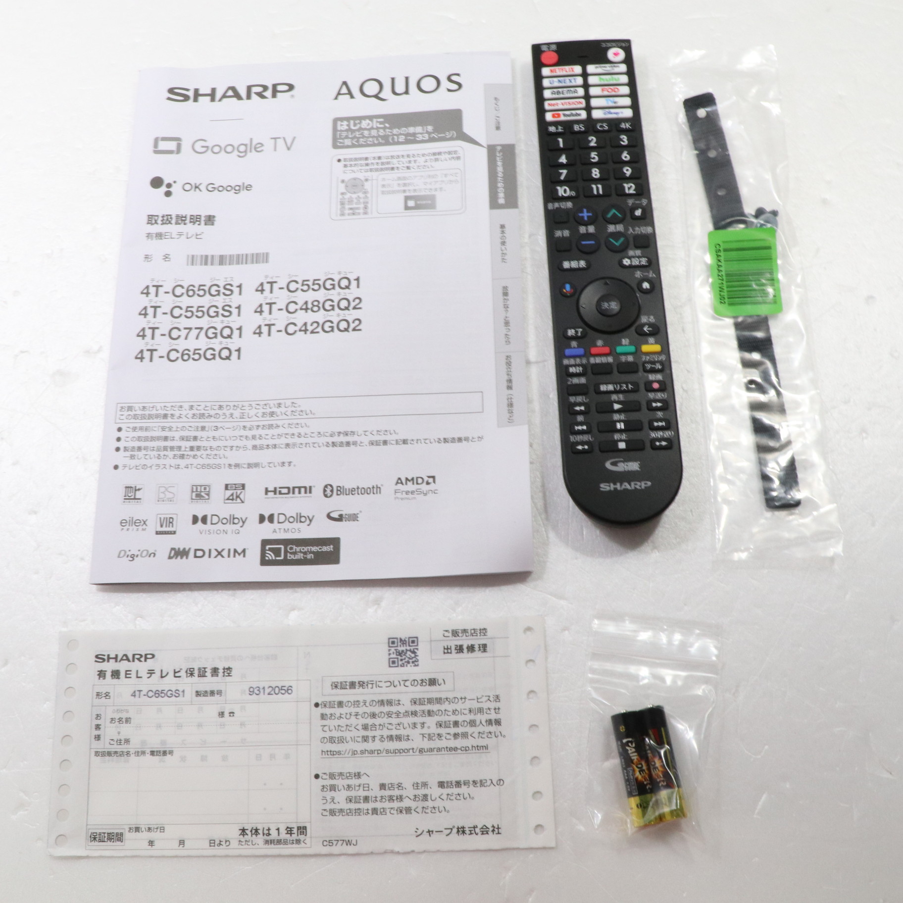 〔付属品〕取扱説明書、かんたん使い方ガイド、リモコン、リモコン用単4形乾電池×2、スタンド一式、スタンドカバー、転倒防止ベルト一式、スタンド回転ロックネジ