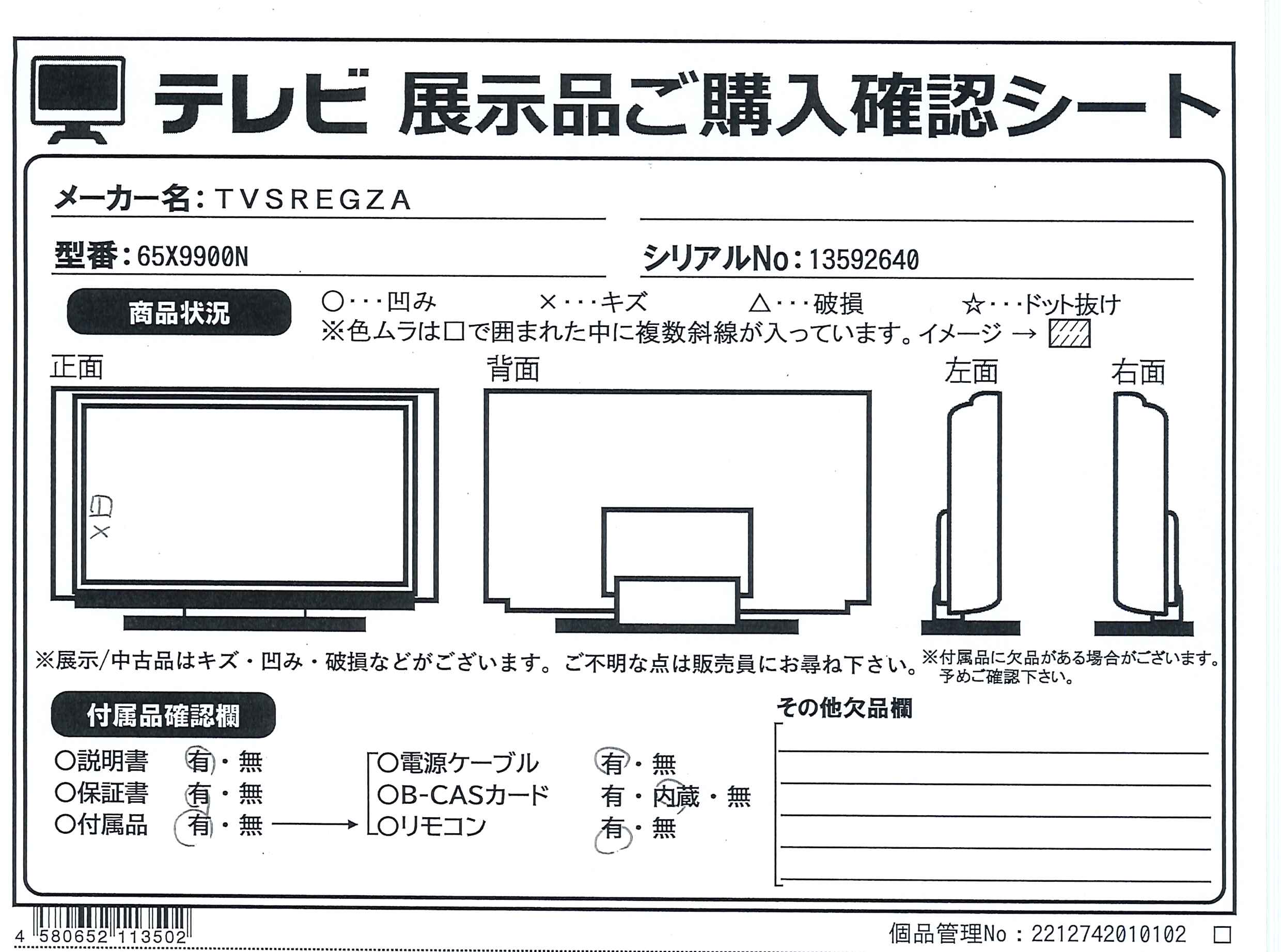 中古商品ランクについて 付属品・商品状態について 〔付属品〕説明書、スタンド一式、リモコン、単四形乾電池×2、電源コード、転倒防止バンド一式、コードクランプ、ケーブルカバー、スタンドカバー