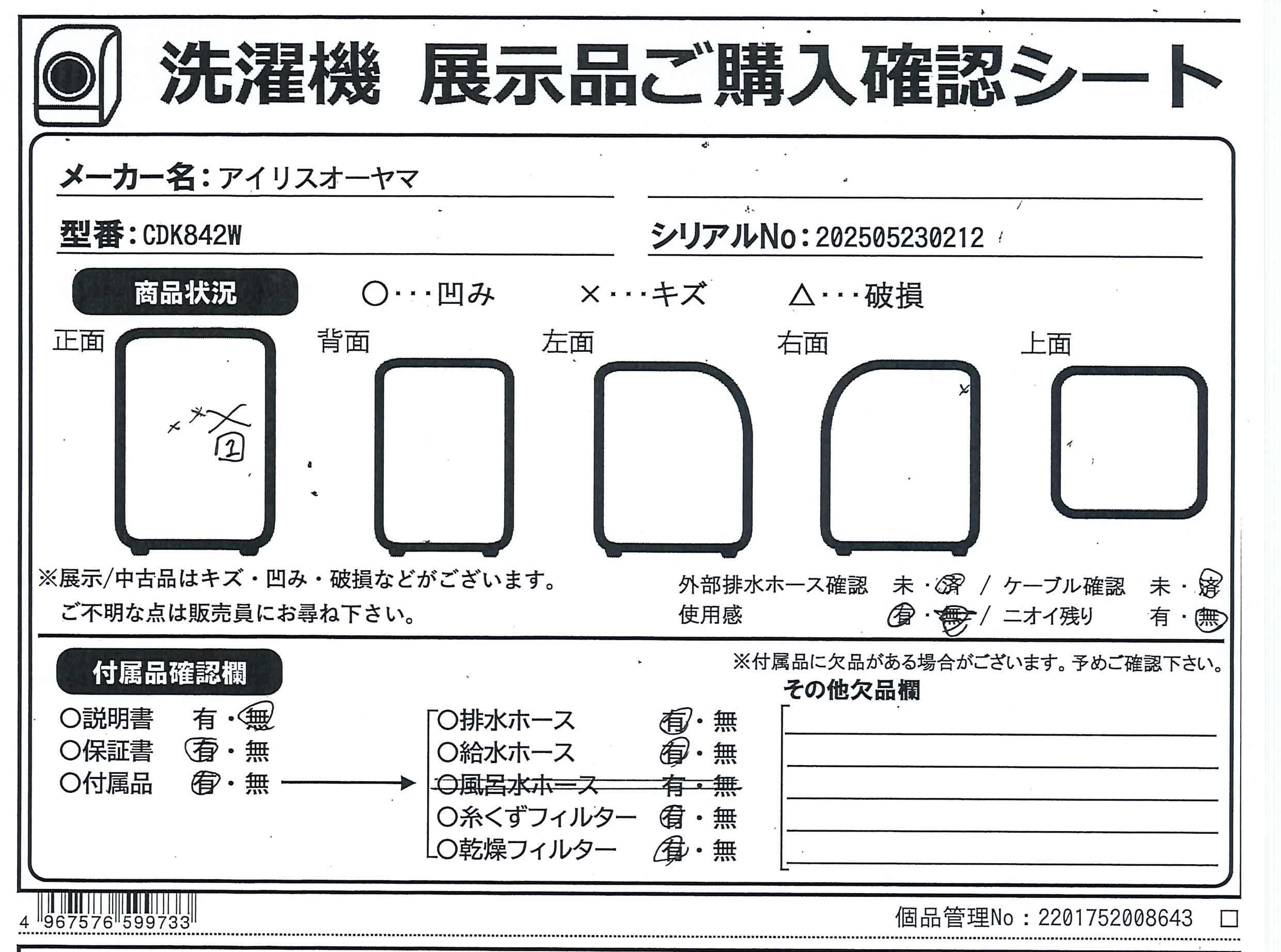 中古商品ランクについて 付属品・商品状態について 〔付属品〕据付説明書、かんたん操作ガイド、給水ホース、ホース継手、排水ホース、ホースクリップ、輸送用固定ねじ穴キャップ×4、輸送用固定ねじ×4、スパナ(輸送用固定ねじ用、調節脚用)、接続口キャップ