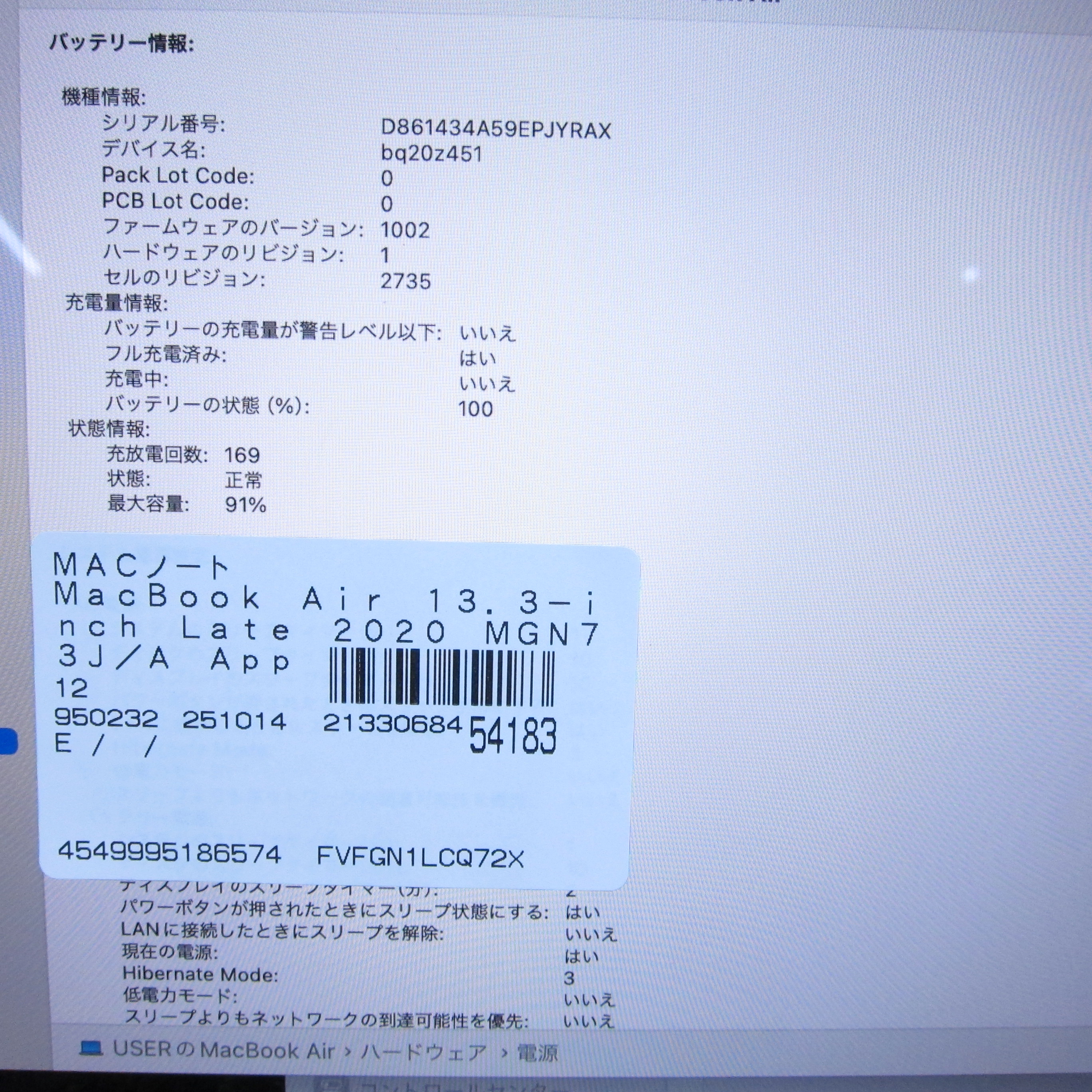〔中古品〕 MacBook Air 13.3-inch Late-2020 MGN73J/A Apple M1 8コアCPU_8コアGPU 16GB SSD1TB スペースグレイ 〔14.7 Sonoma〕 [グラフィック:オンボード/JISキーボード]