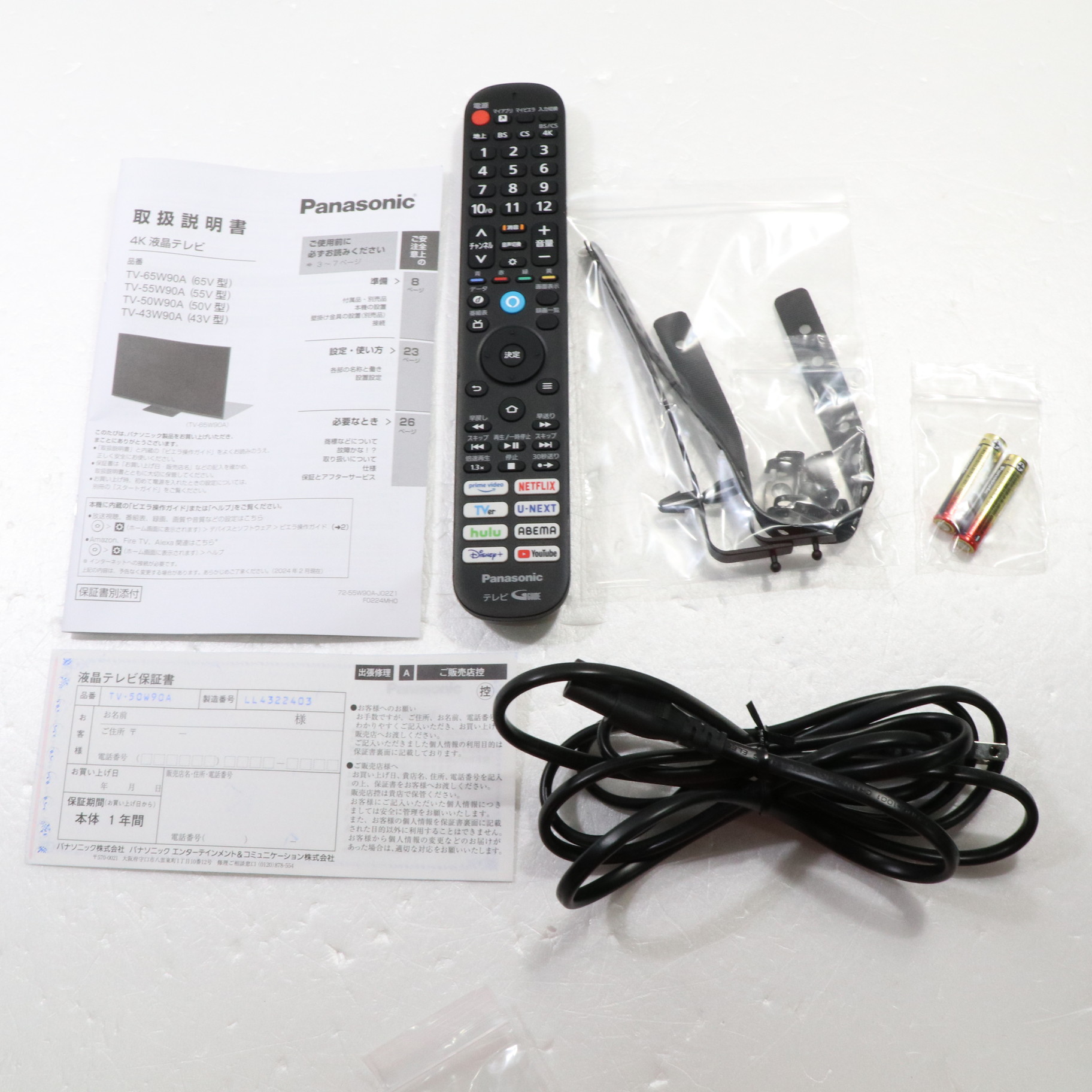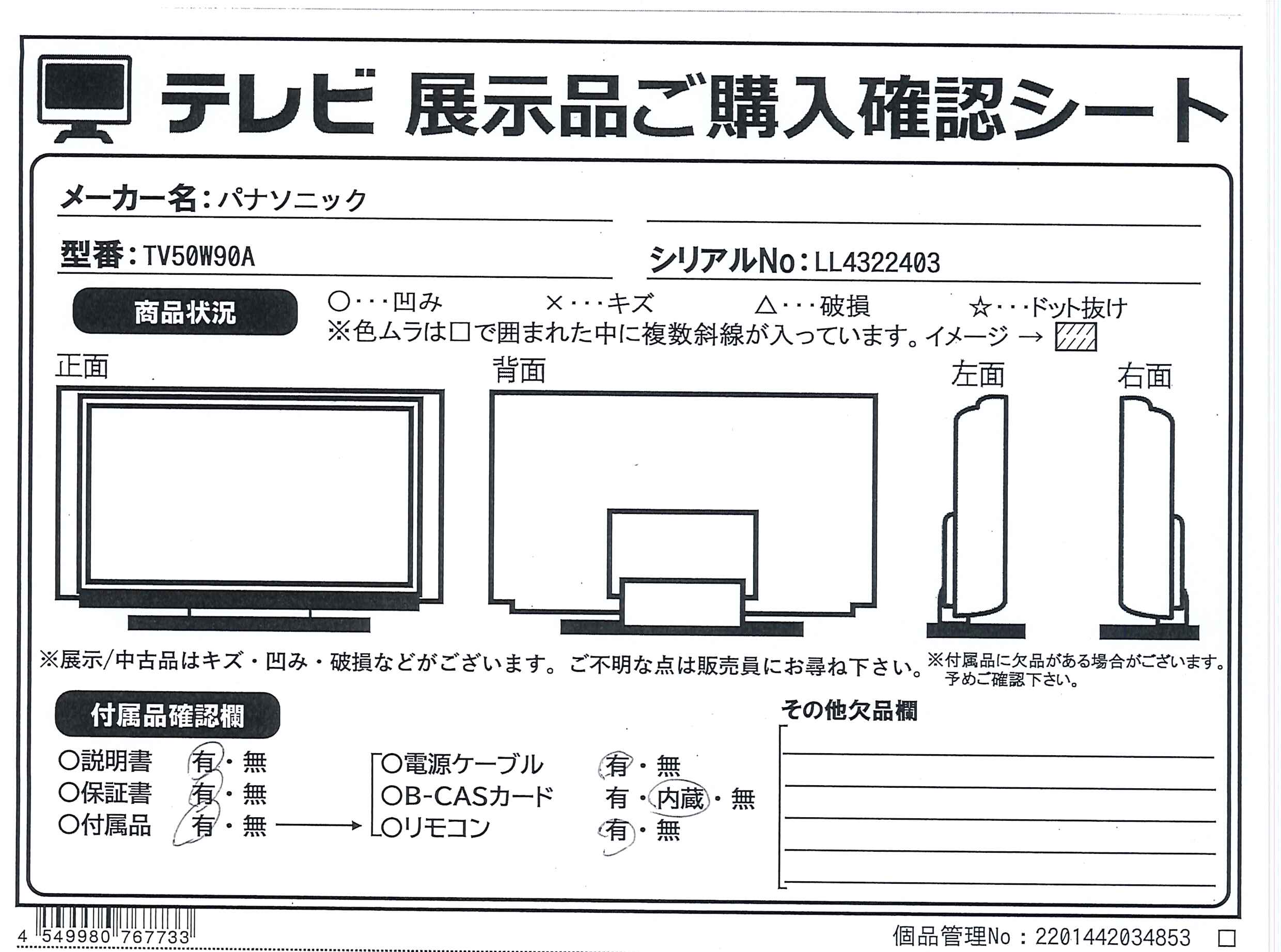 中古商品ランクについて 付属品・商品状態について 〔付属品〕説明書、リモコン、リモコン用乾電池×2、電源コード、スタンド一式、クランパー×2、転倒・落下防止部品一式