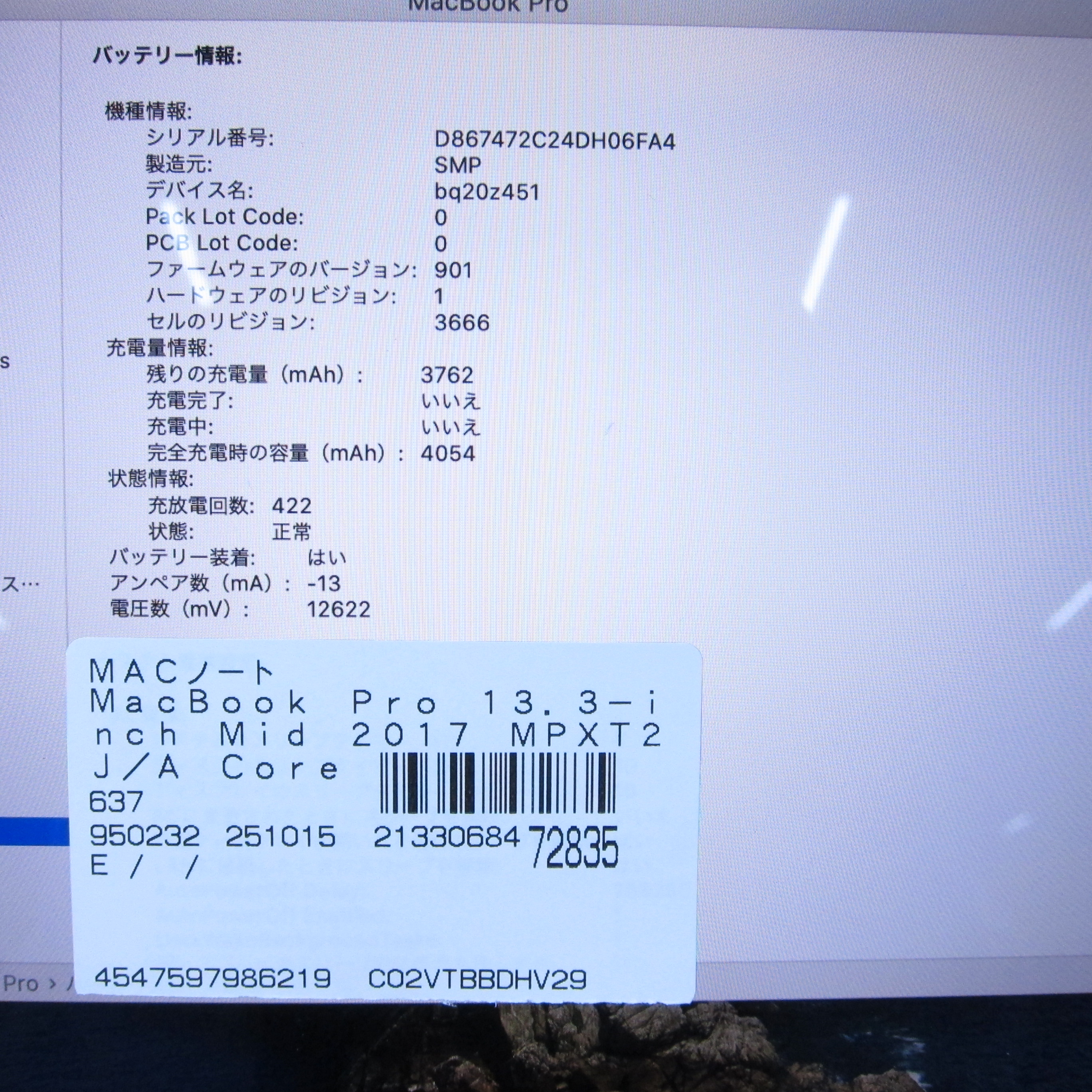 〔中古品〕 MacBook Pro 13.3-inch Mid-2017 MPXT2J/A Core_i5 2.3GHz 8GB SSD256GB スペースグレイ 〔10.15 Catalina〕 [グラフィック:Intel Iris Plus Graphics 640(CPU内蔵)/JISキーボード]