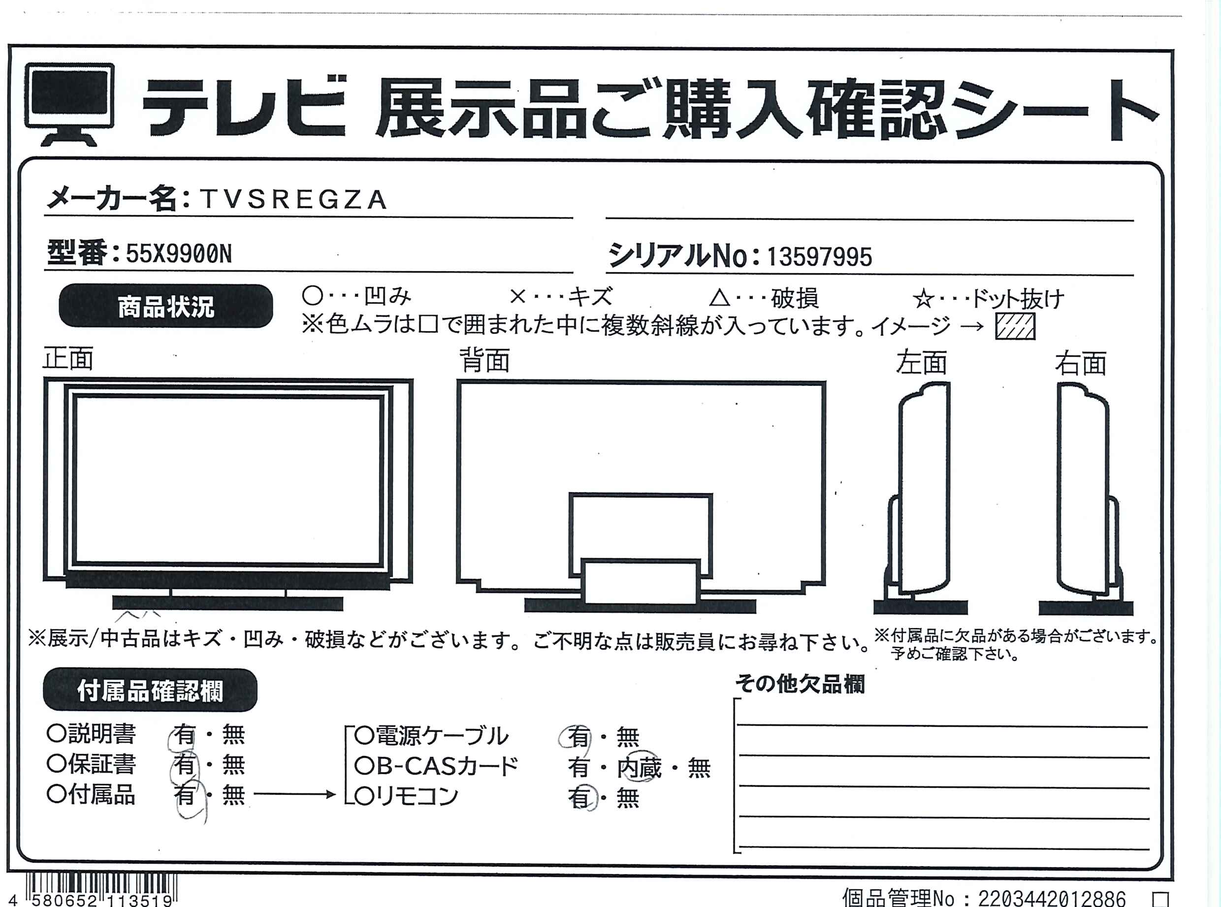 中古商品ランクについて 付属品・商品状態について 〔付属品〕取扱説明書、リモコン、リモコン用乾電池×2、スタンド一式、電源コード、転倒防止バンド一式、コードクランプ、スタンドカバー