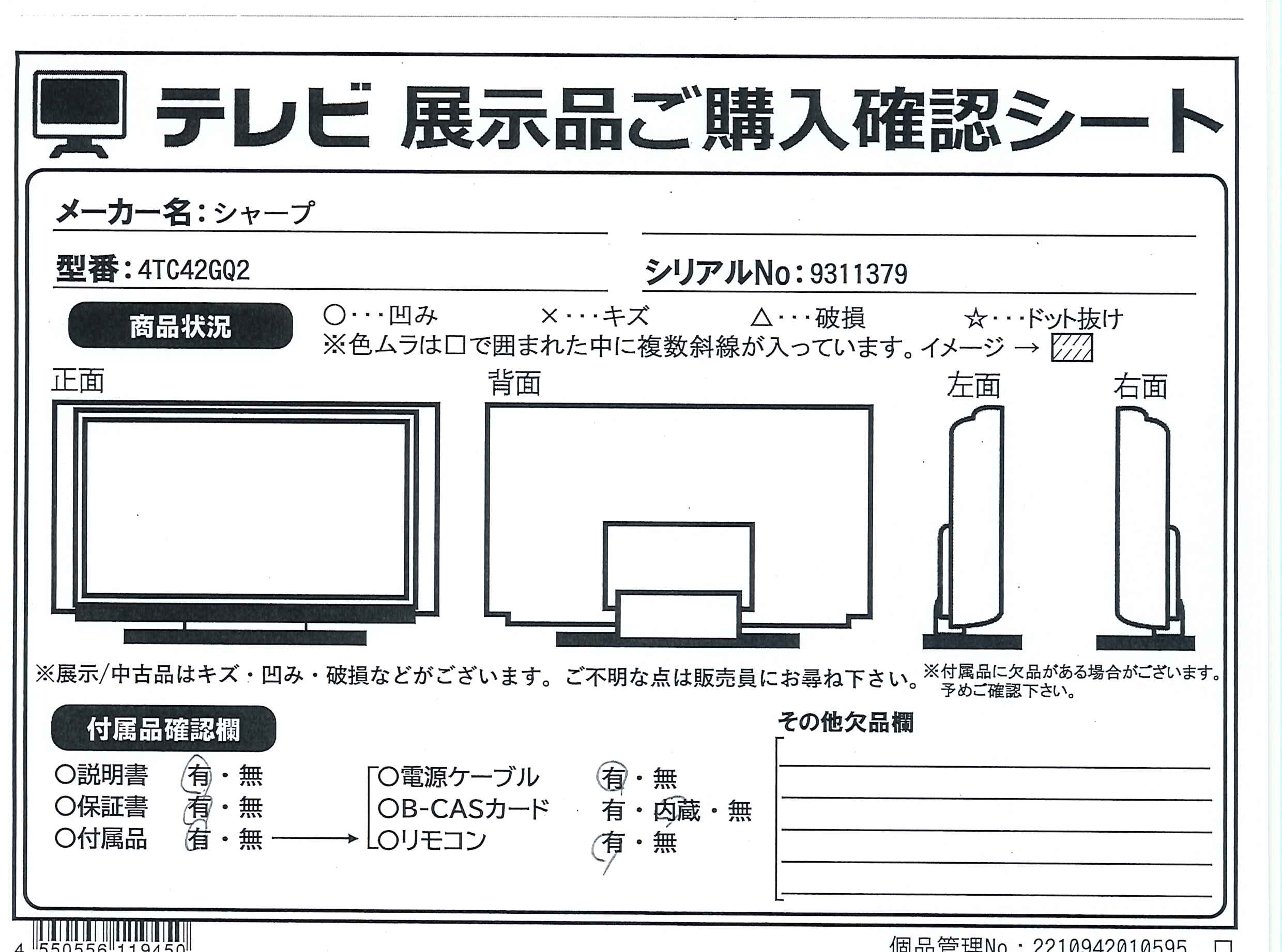 中古商品ランクについて 付属品・商品状態について 〔付属品〕取扱説明書、かんたん使い方ガイド、リモコン、リモコン用単4形乾電池×2、スタンド取付金具、スタンドカバー、スタンドベース、スタンド組立用ネジ×4、スタンド取付用ネジ×4、転倒防止ベルト一式、スタンド回転ロックネジ