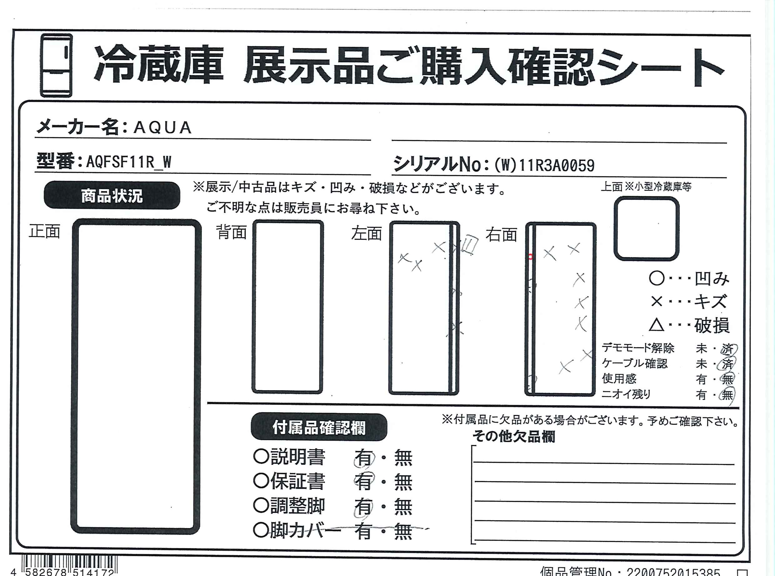 • 「冷蔵庫・標準搬入設置費」は、1,100円(税込)です。