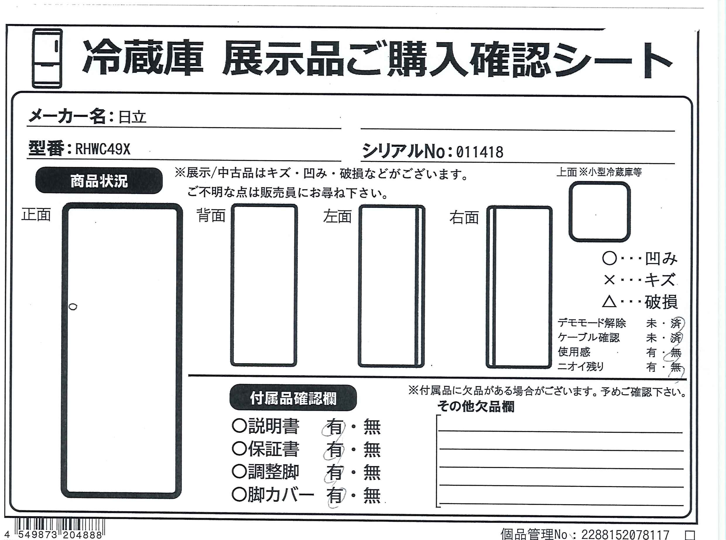 中古商品ランクについて 付属品・商品状態について 〔付属品〕説明書、脚カバー、調節脚、クッション、小物ケース、タマゴケース、給水タンク一式、製氷スコップ、大型アルミトレイ