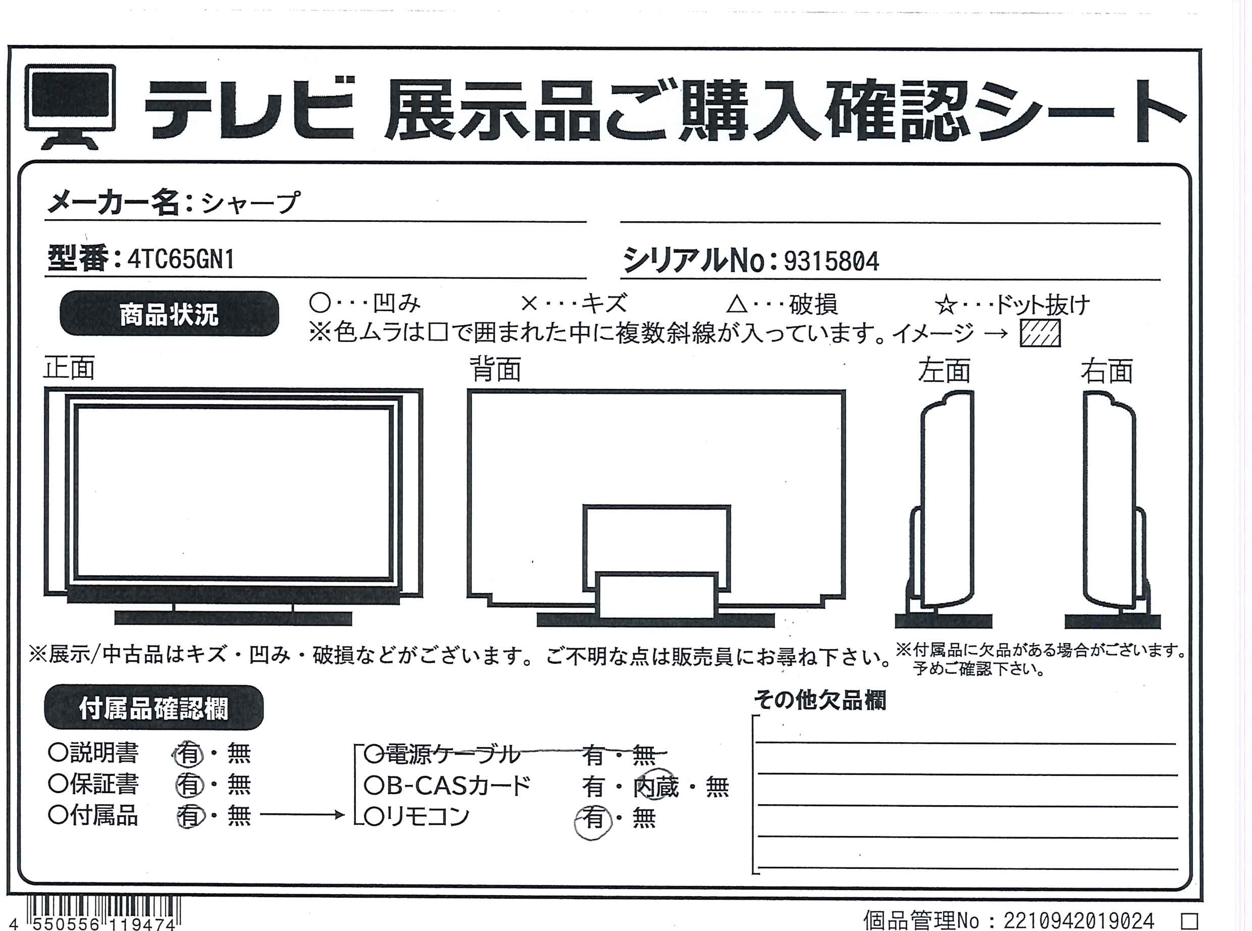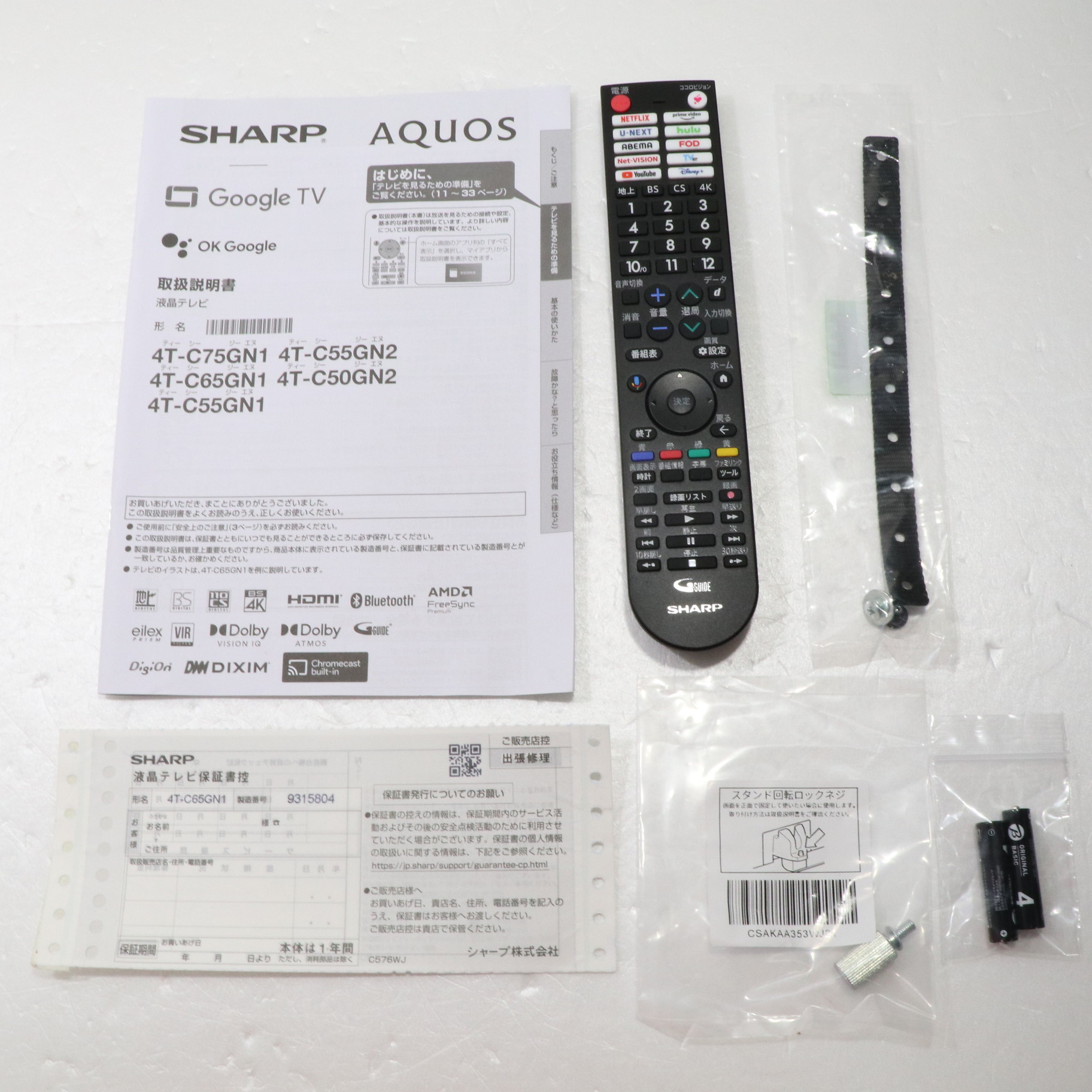 中古商品ランクについて 付属品・商品状態について 〔付属品〕取扱説明書、かんたん使い方ガイド、スタンドベース、スタンド取付金具、スタンドカバー、スタンド組立用ネジ×4(長さ25mm)、スタンド取付用ネジ×4(長さ12mm)、スタンドカバー取付用ネジ、転倒防止ベルト一式、スタンド回転ロックネジ、リモコン、リモコン用単4形乾電池×2
