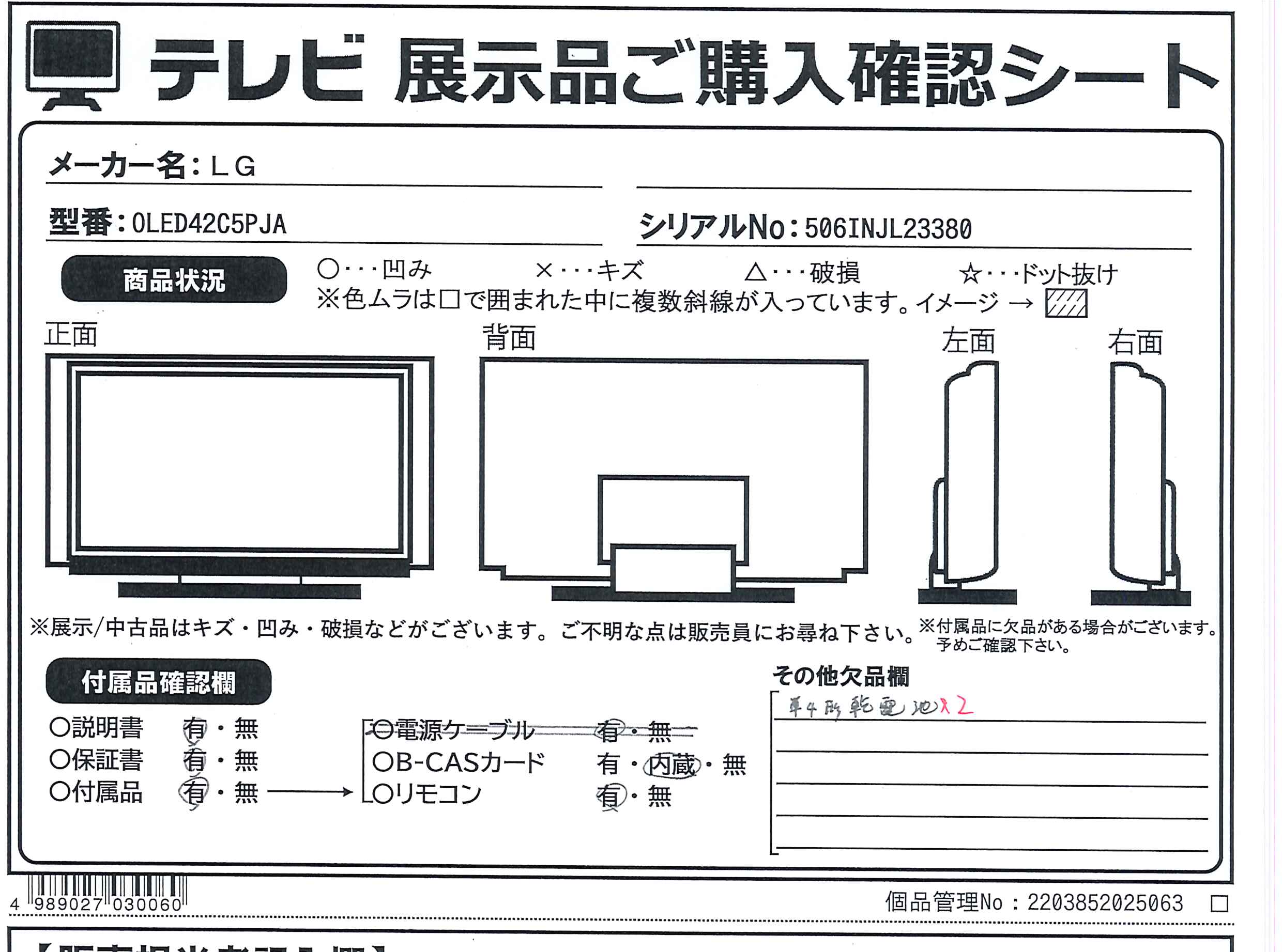 中古商品ランクについて 付属品・商品状態について 〔付属品〕取扱説明書、ガイド、マジックリモコン、スタンド×2、スタンド固定用ネジM4(長さ20mm)×4、AVカバー、顛倒防止バンド一式、スタンドケーブルホルダー×2、ヘッドケーブルホルダー