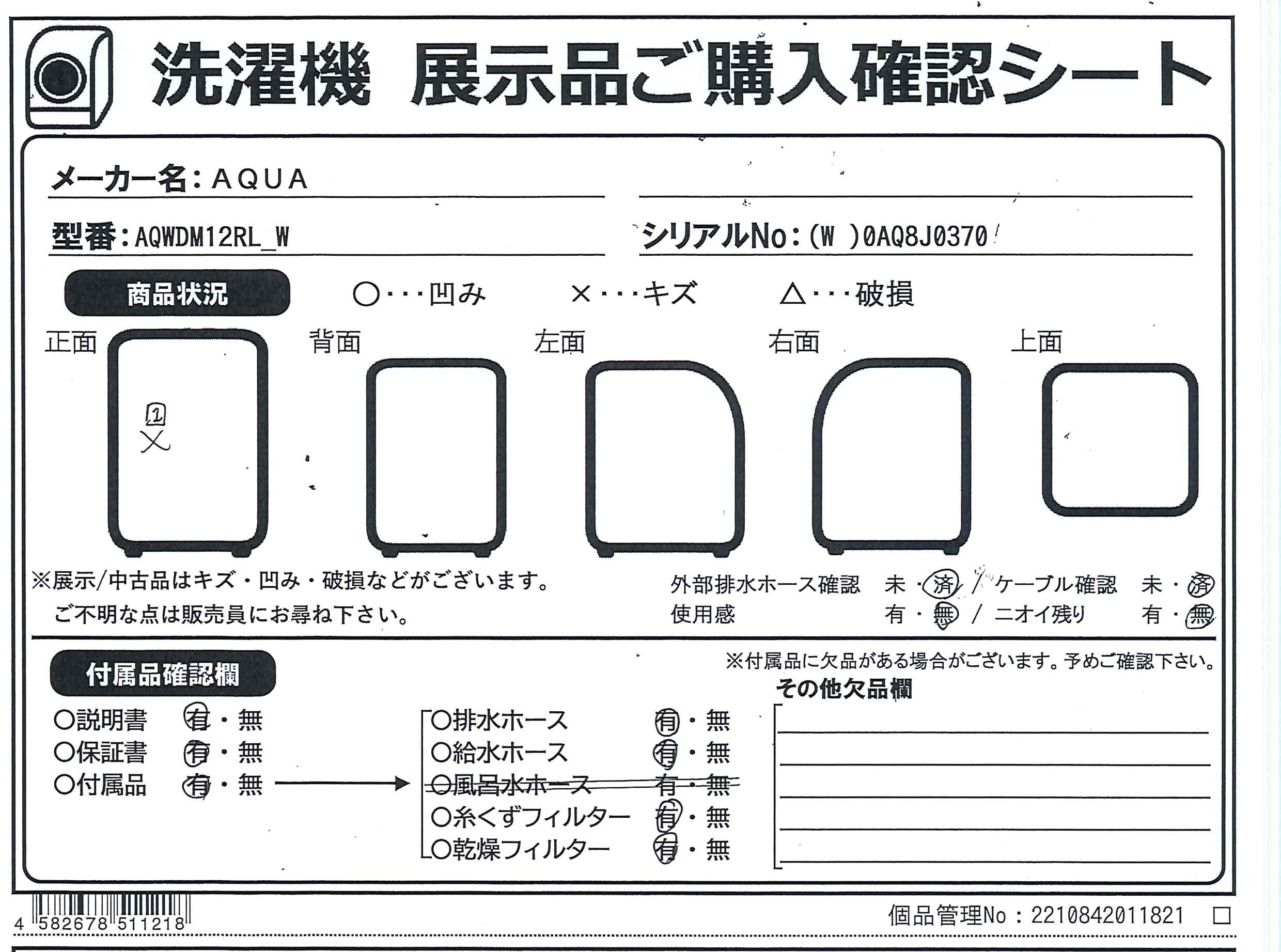 ▼同型番の新品商品はこちら![]() AQUA ドラム式洗濯乾燥機 AQUA ホワイト AQW-DM12R-L(W) [洗濯12.0kg /乾燥6.0kg /ヒートポンプ乾燥 /左開き] ¥162,800(税込) 16,280ポイントサービス 在庫限り |