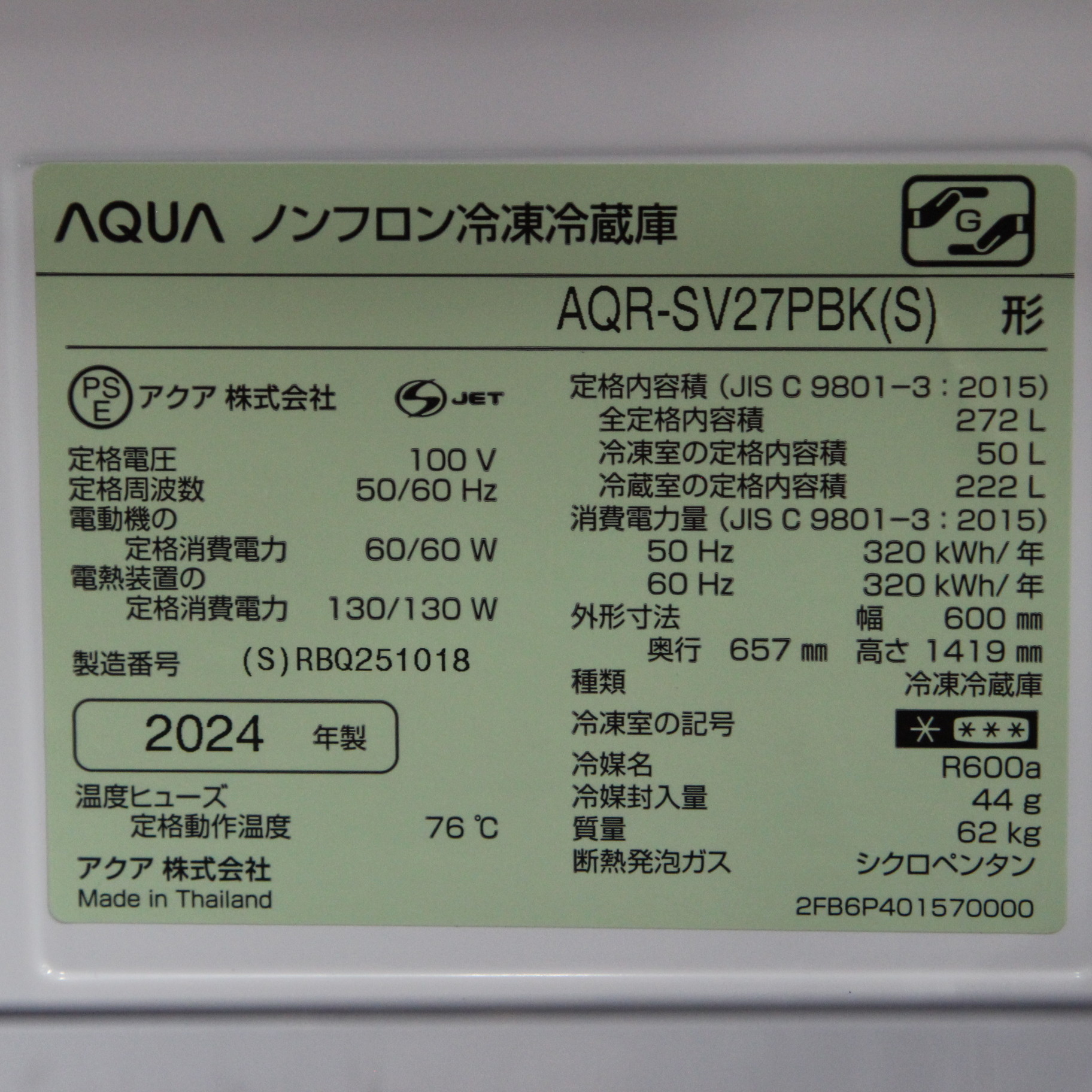 〔展示品〕 冷蔵庫 ブライトシルバー AQR-SV27PBK(S) [幅60cm /272L /3ドア /右開きタイプ /2023年]