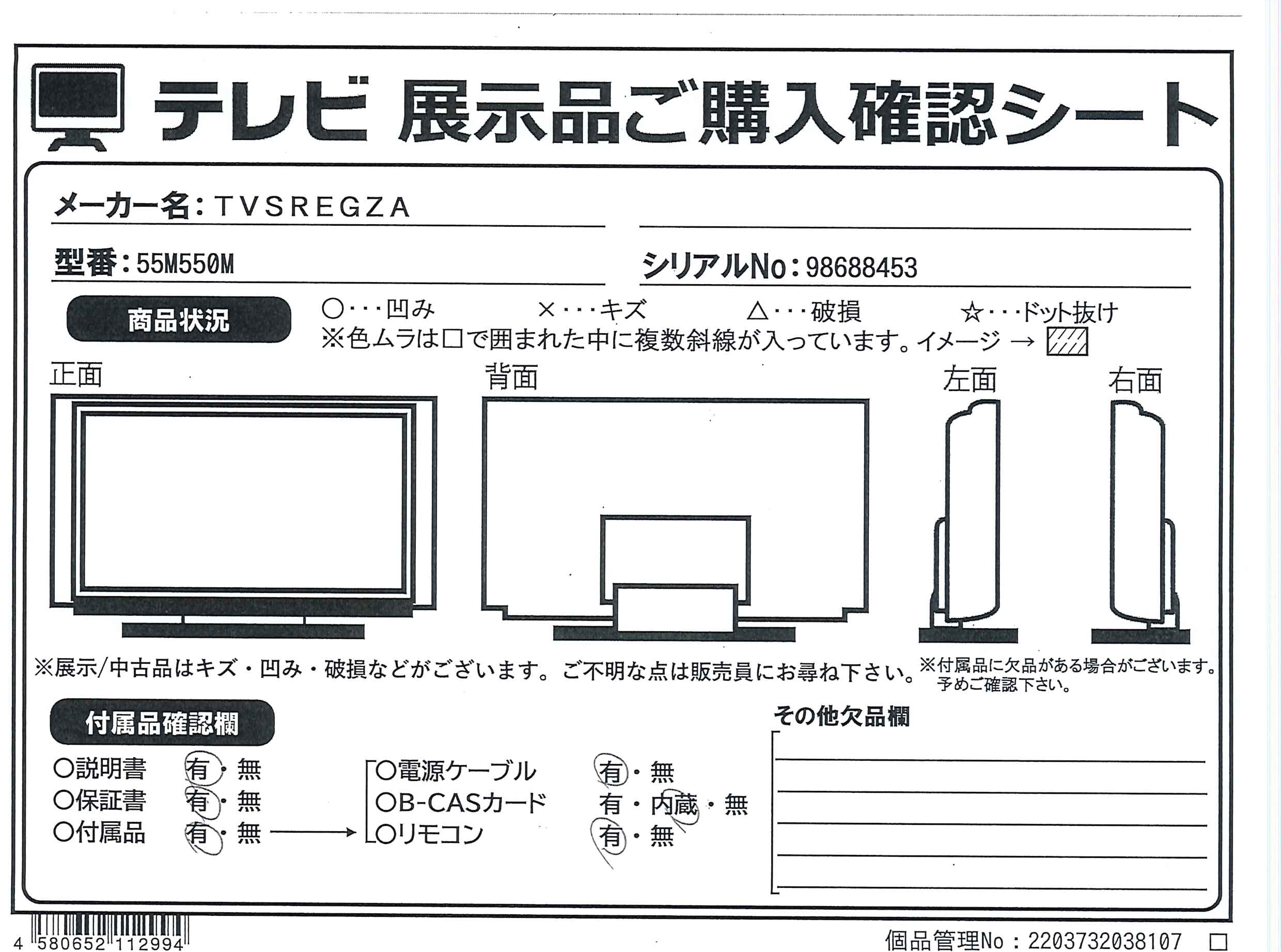 中古商品ランクについて 付属品・商品状態について 〔付属品〕説明書、スタンド、スタンドM5ネジ×4、リモコン、リモコン用単4形乾電池×2、電源コード、転倒防止バンド×2、転倒防止ネジ(長)×2、転倒防止ネジ(短)×2