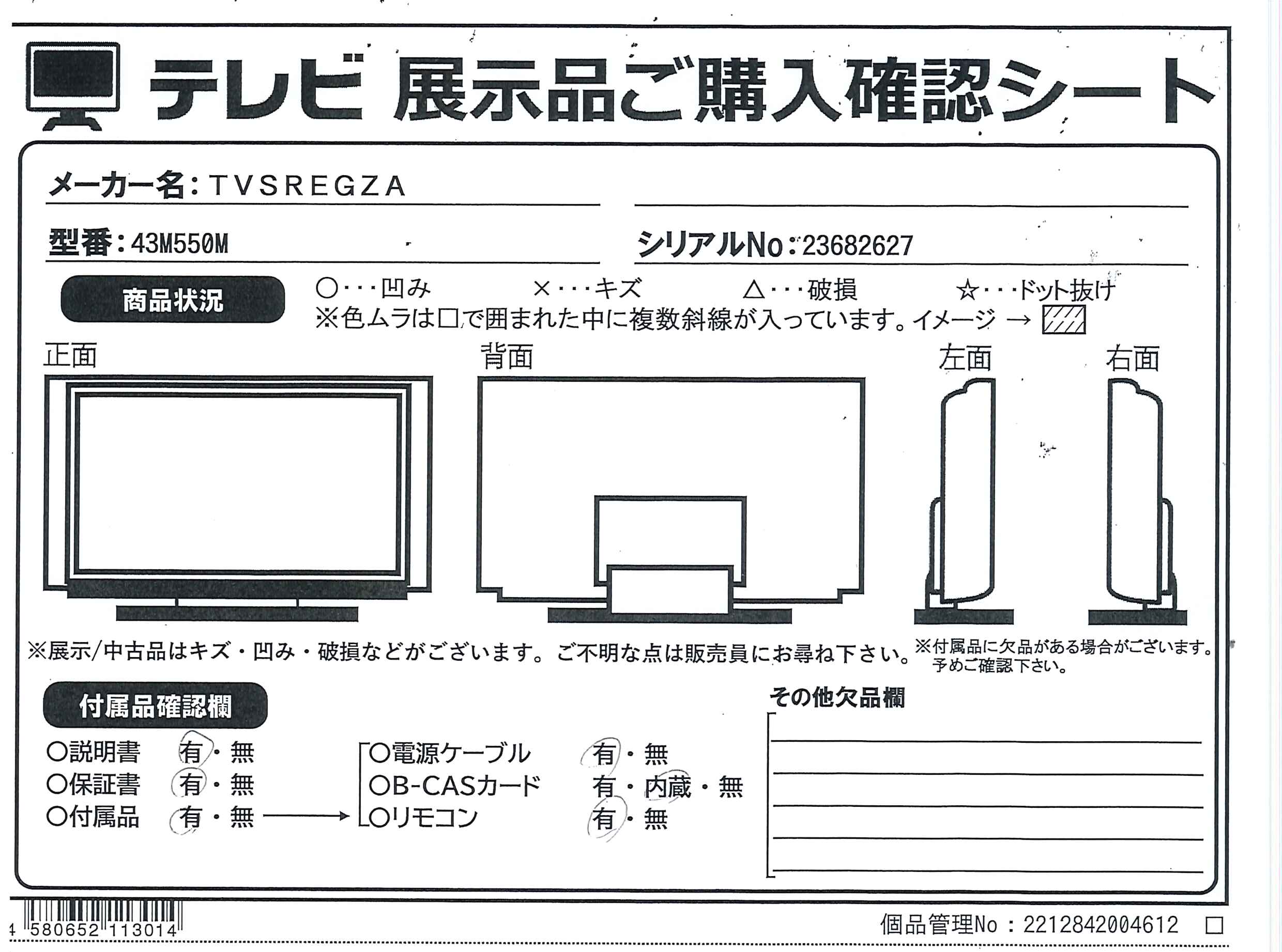 中古商品ランクについて 付属品・商品状態について 〔付属品〕説明書、スタンド取付説明書、スタンド、スタンド取付ネジX4、リモコン、リモコン用乾電池、転倒防止バンドX2、ネジ(長)X2、ネジ(短)X2、電源コード