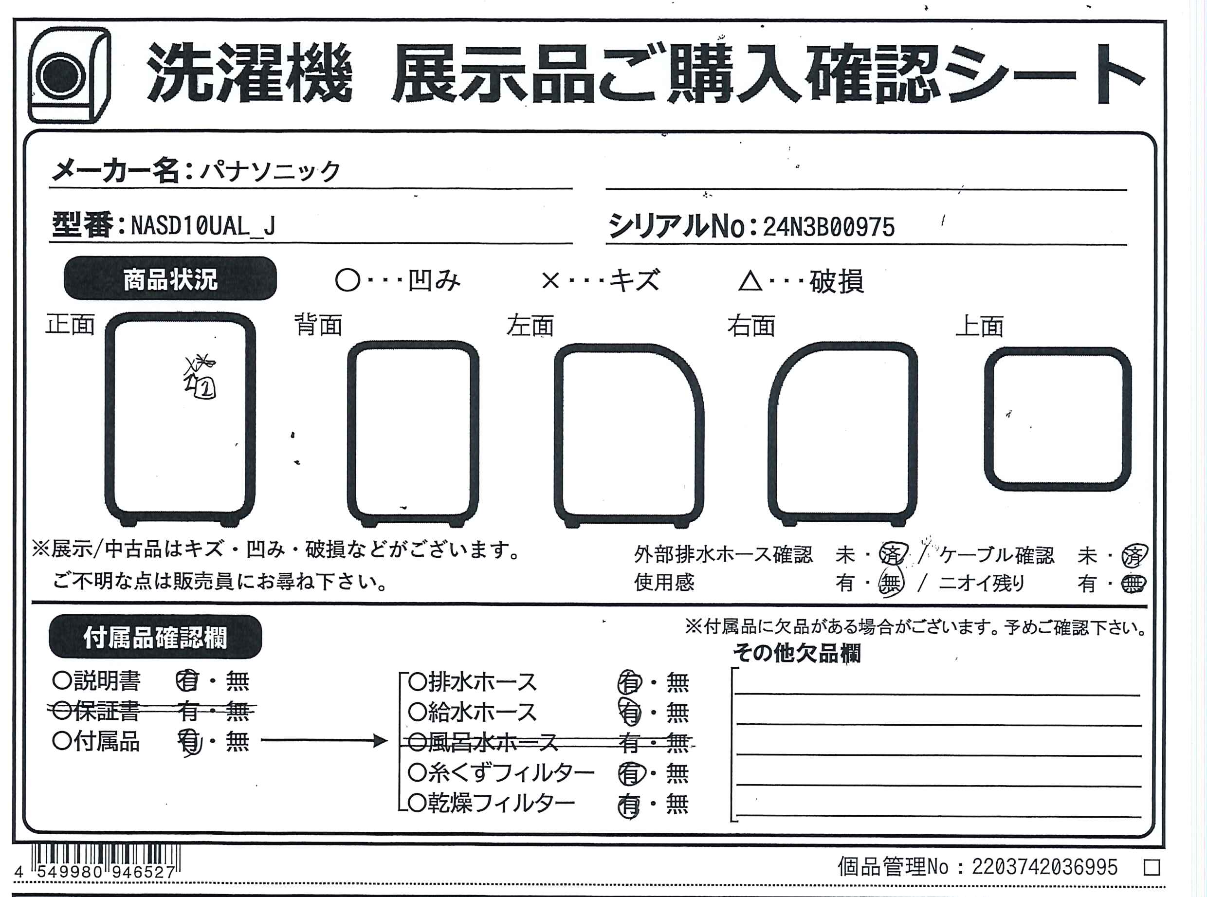 中古商品ランクについて 付属品・商品状態について 〔付属品〕取扱説明書、かんたんガイド、給水ホース(長さ0.8m)、外部排水ホース(ホースバンド付き)、カバー×2、カバー用ネジ×2、ホース穴カバー