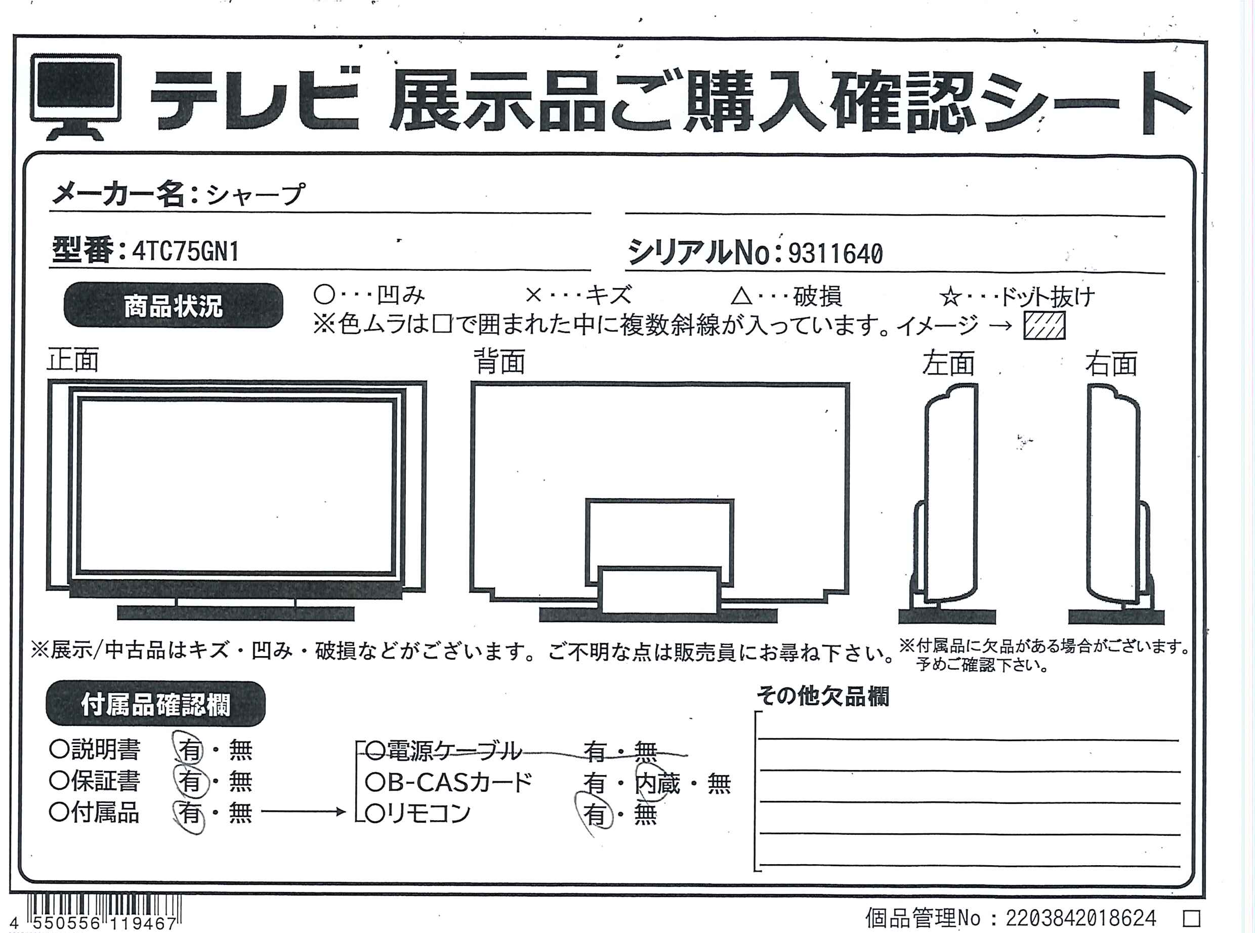 ![SHARP(シャープ) 液晶テレビ AQUOS ブラック 4T-C75GN1 [75V型 /Bluetooth対応 /4K対応 /BS・CS 4Kチューナー内蔵 /YouTube対応]](https://image.sofmap.com/images/product/large/4550556119467.jpg)
